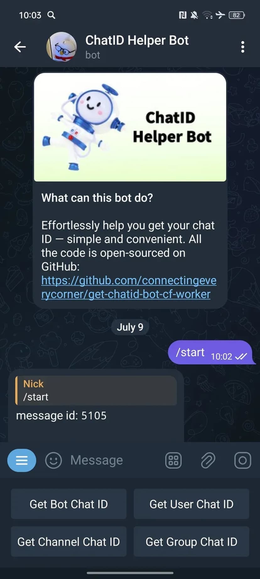 - Функция: определение и возврат числового chat ID прямо в чате через стандартный интерфейс.