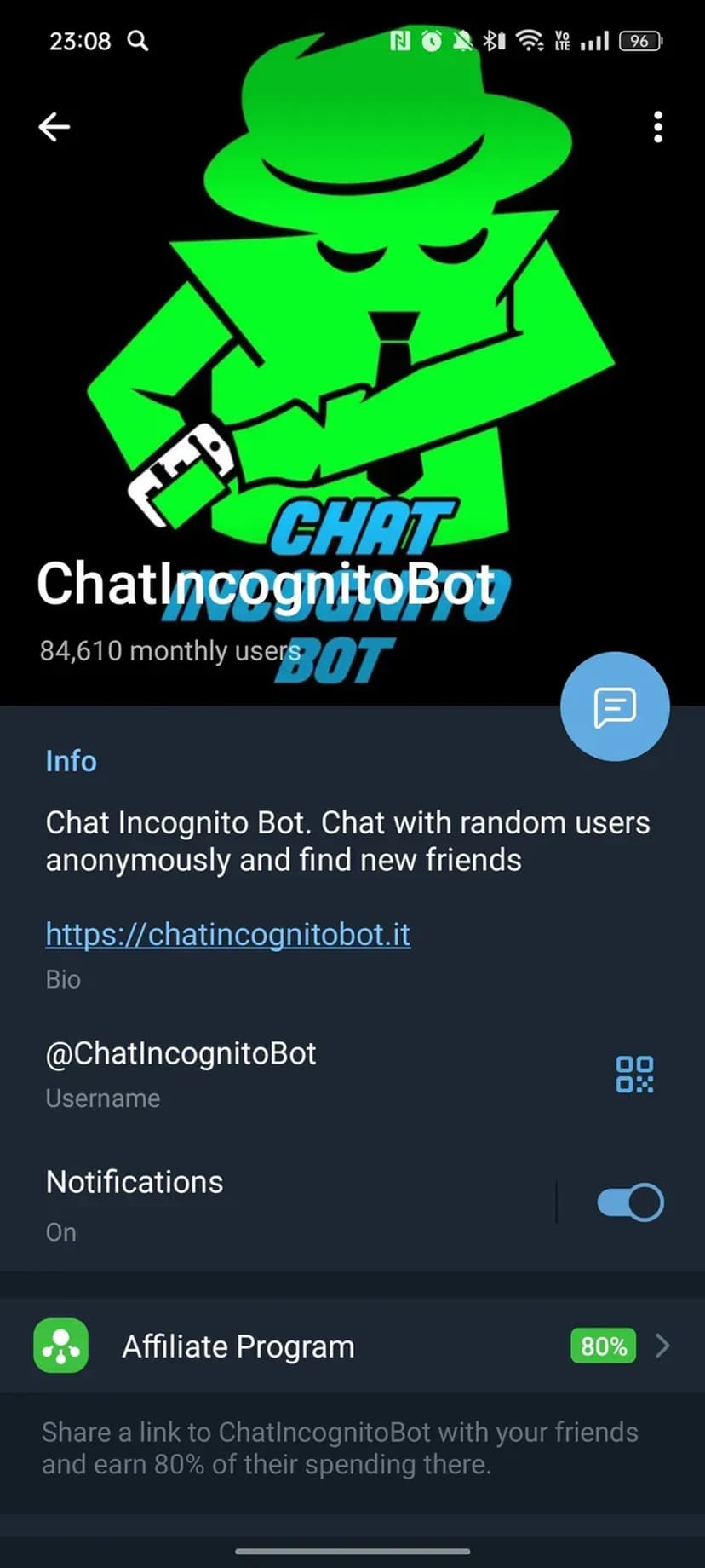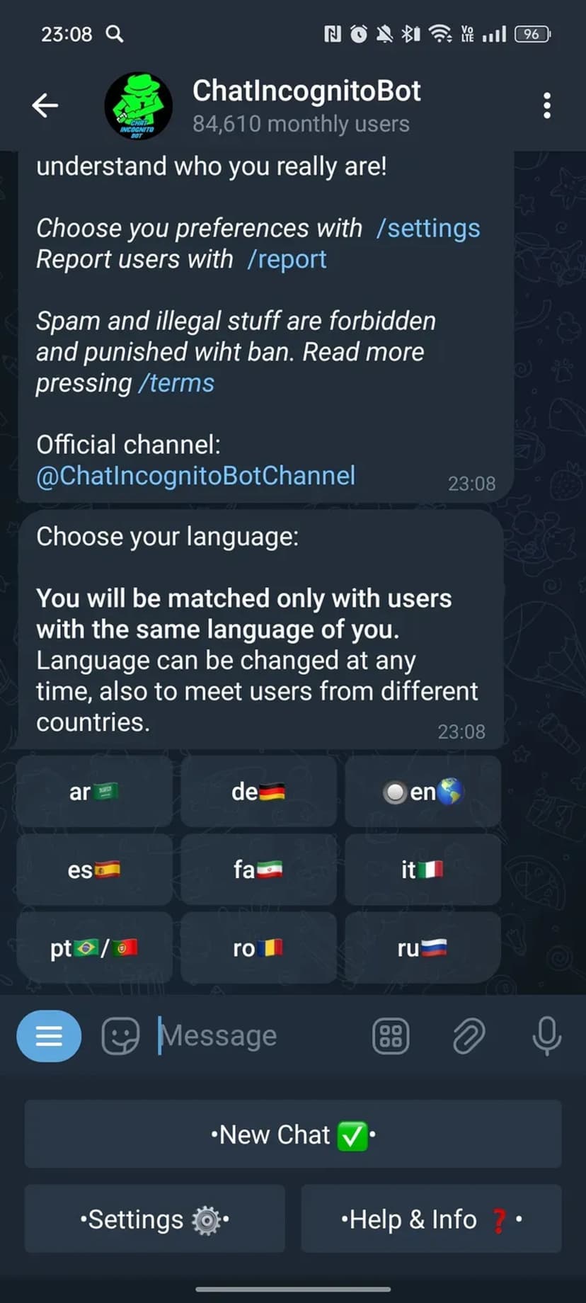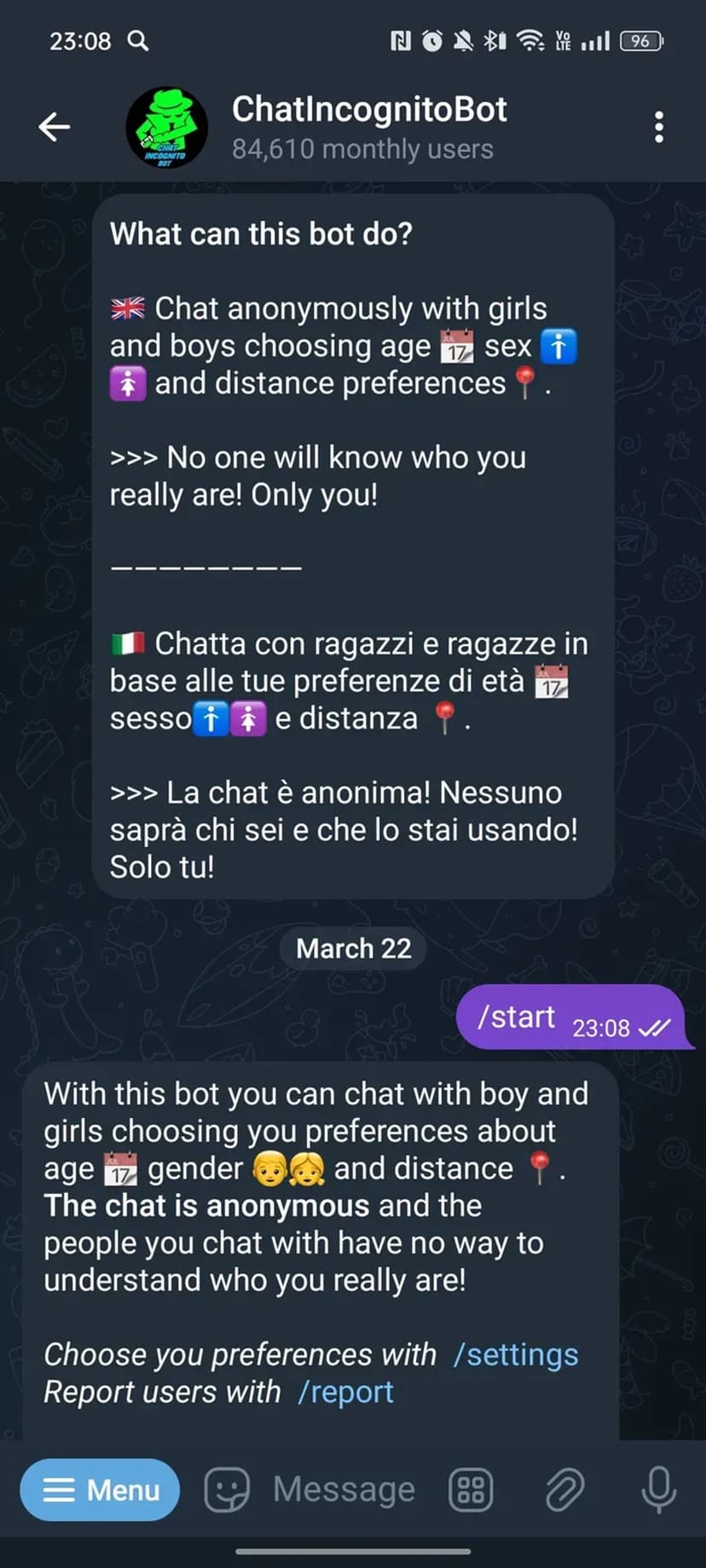 ChatIncognitoBot — анонимный бот для текстового общения с незнакомцами. Бот соединяет пользователей по заданным критериям и скрывает идентифицирующую информацию: все сообщения проходят через сервер бота, прямого контакта между участниками нет.