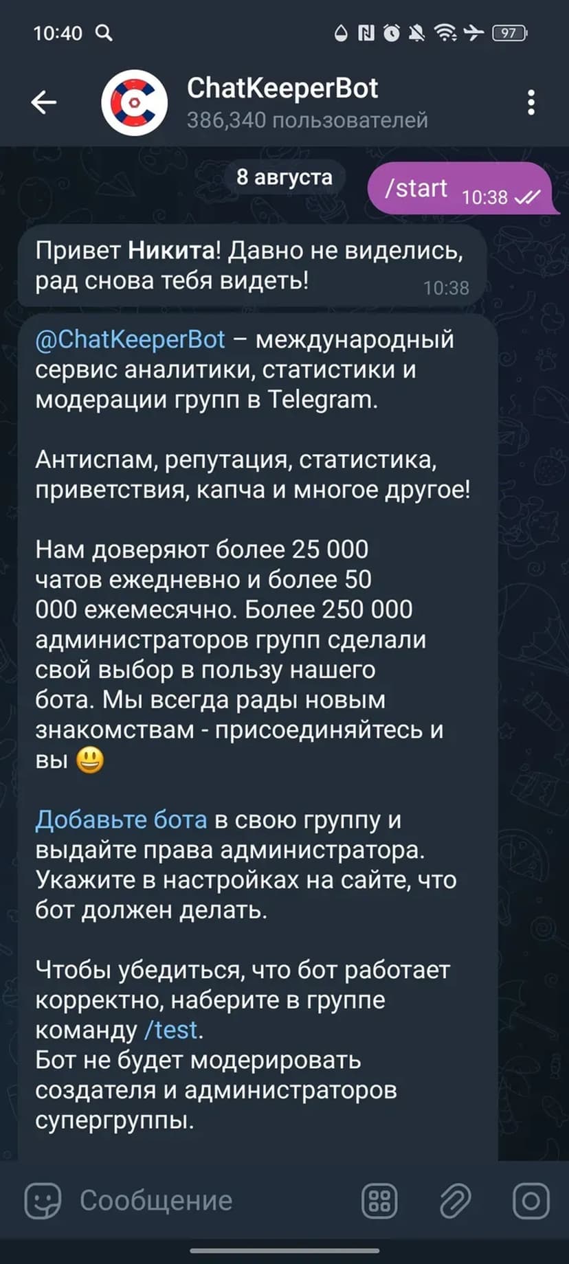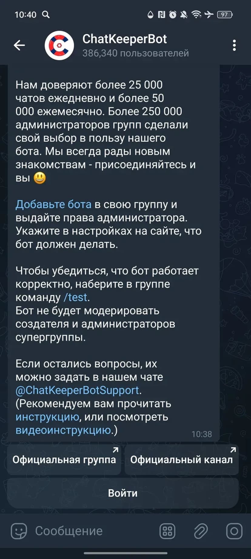 Кому не подойдёт: владельцам небольших приватных чатов без необходимости модерации или тем, кто не готов предоставлять боту права администратора.