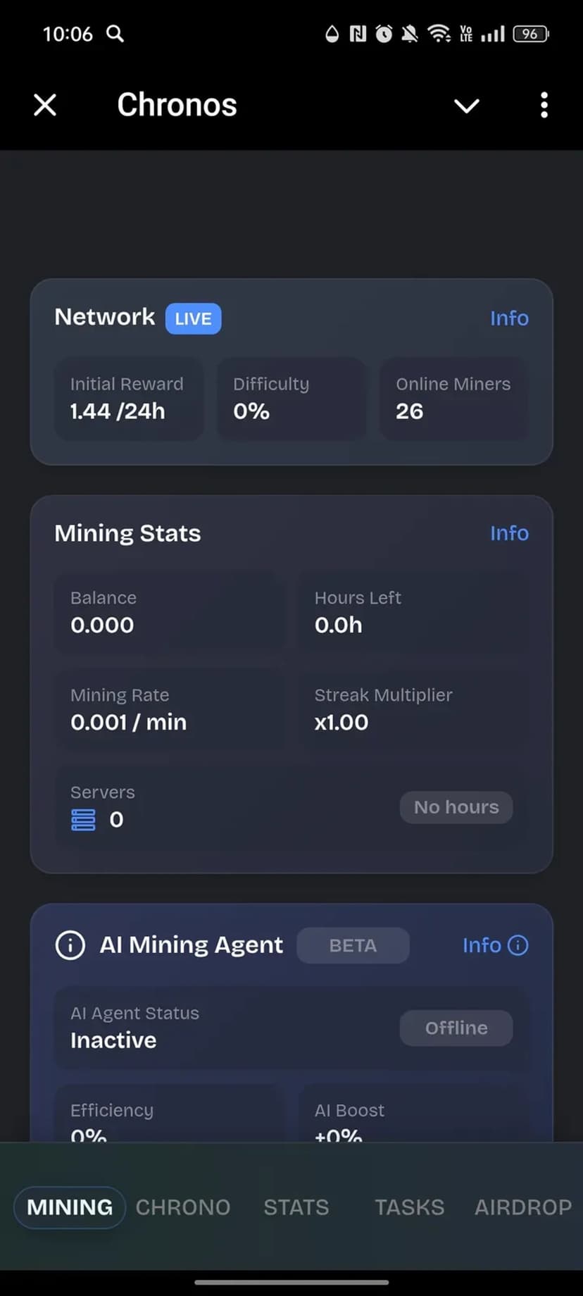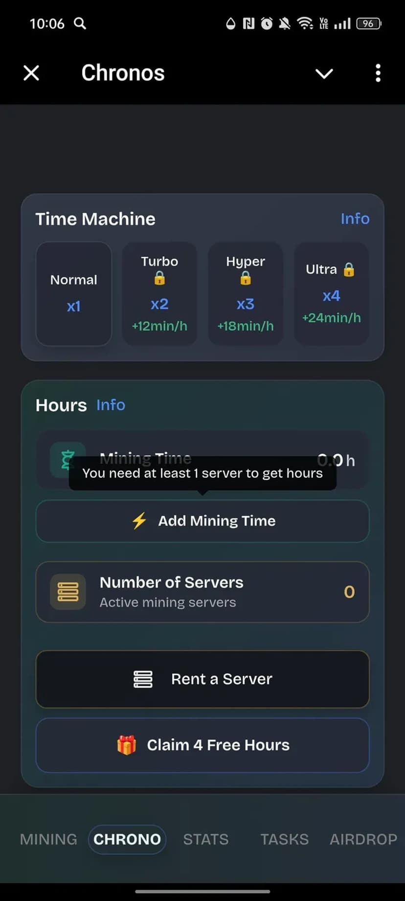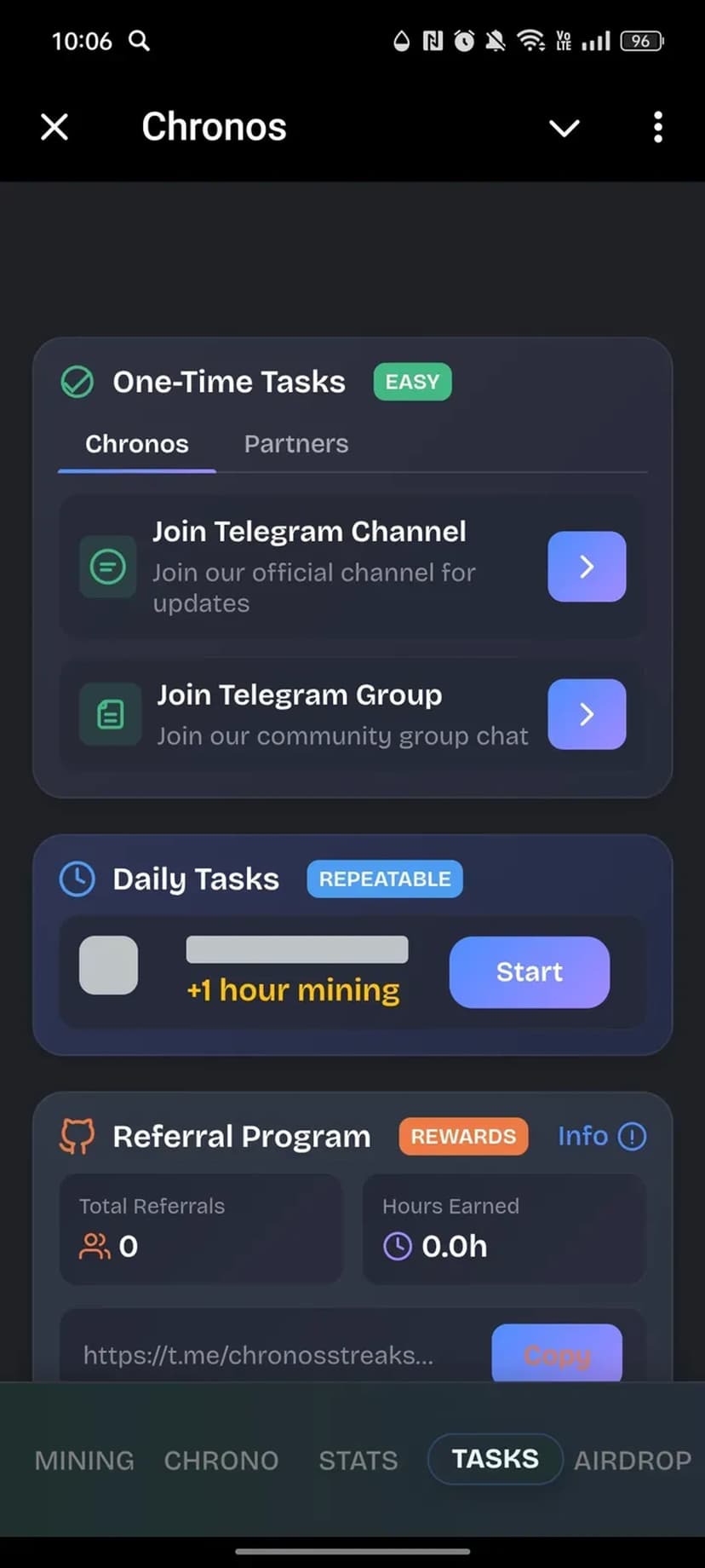 Chronos — мини‑приложение, дающее возможность зарабатывать внутриигровые токены, которые впоследствии будут распределены в TON‑блокчейне. Ключевая особенность сервиса — пассивный майнинг: после активации процесс ведёт учёт и начисление без постоянного участия пользователя.
