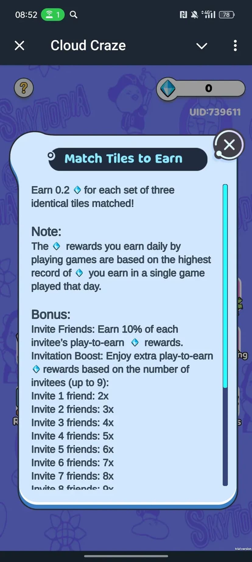 Cloud Craze — казуальная игра в формате «три‑в‑ряд», доступная как мини‑приложение в Telegram. Игра предлагает проходить уровни, очищая поле путём сопоставления трёх одинаковых плиток, и получать внутриигровые 💎, которые участвуют в обмене на токены через airdrop.