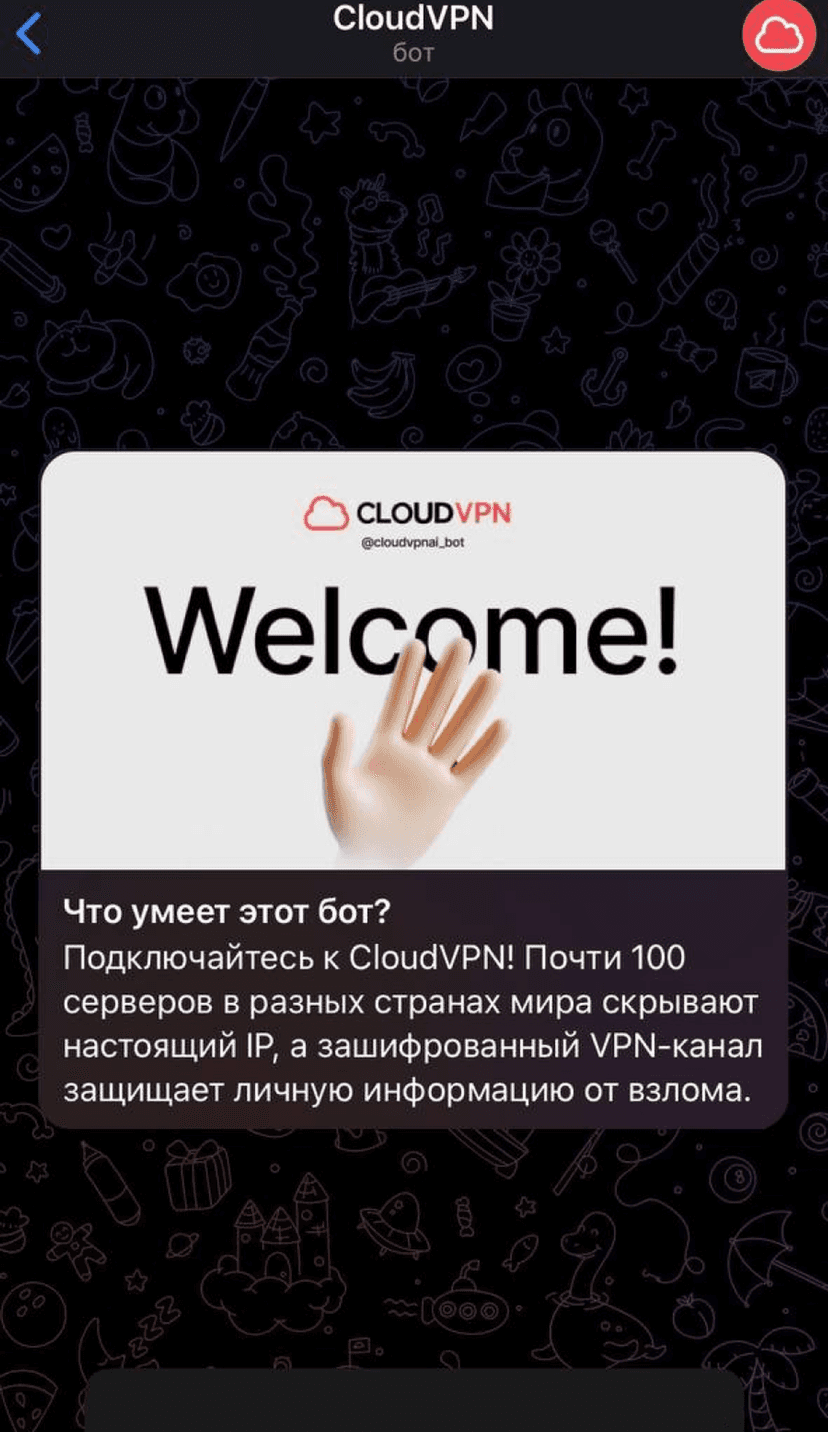 *Нажимая "Открыть в Telegram", вы перейдете к приложению CloudVPN в мессенджере Telegram