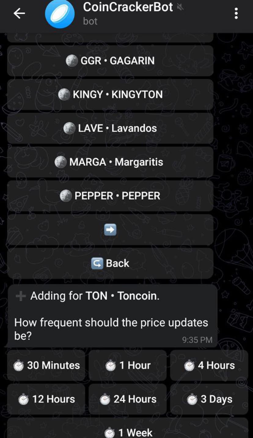 CoinCrackerBot следит за курсами криптовалют и jettons в реальном времени, позволяет управлять портфелем и присылает уведомления о важных изменениях рынка.