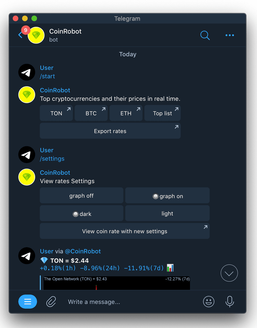 Отображение актуальных курсов популярных криптовалют с обновляемыми графиками и возможностью быстро делиться данными в беседах Telegram.