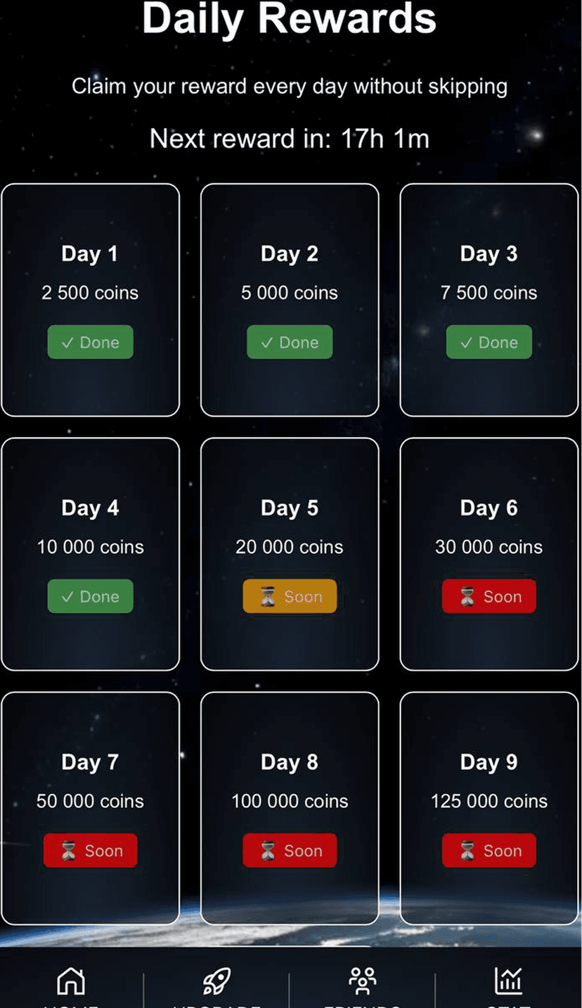 CosmosTap — динамичная tapper-игра, где вы пилотируете космический корабль, собираете внутриигровую валюту (cosmic cash) и инвестируете её в апгрейды, чтобы исследовать всё более удалённые участки космоса.
