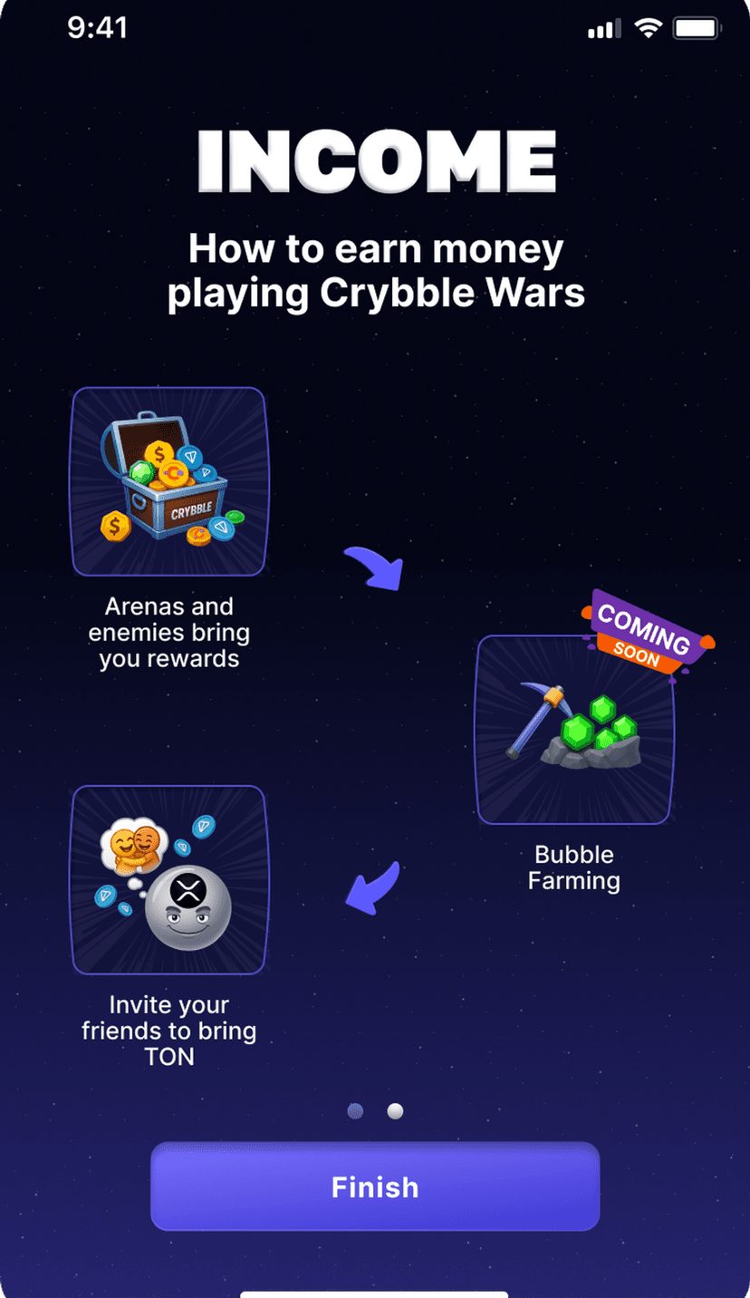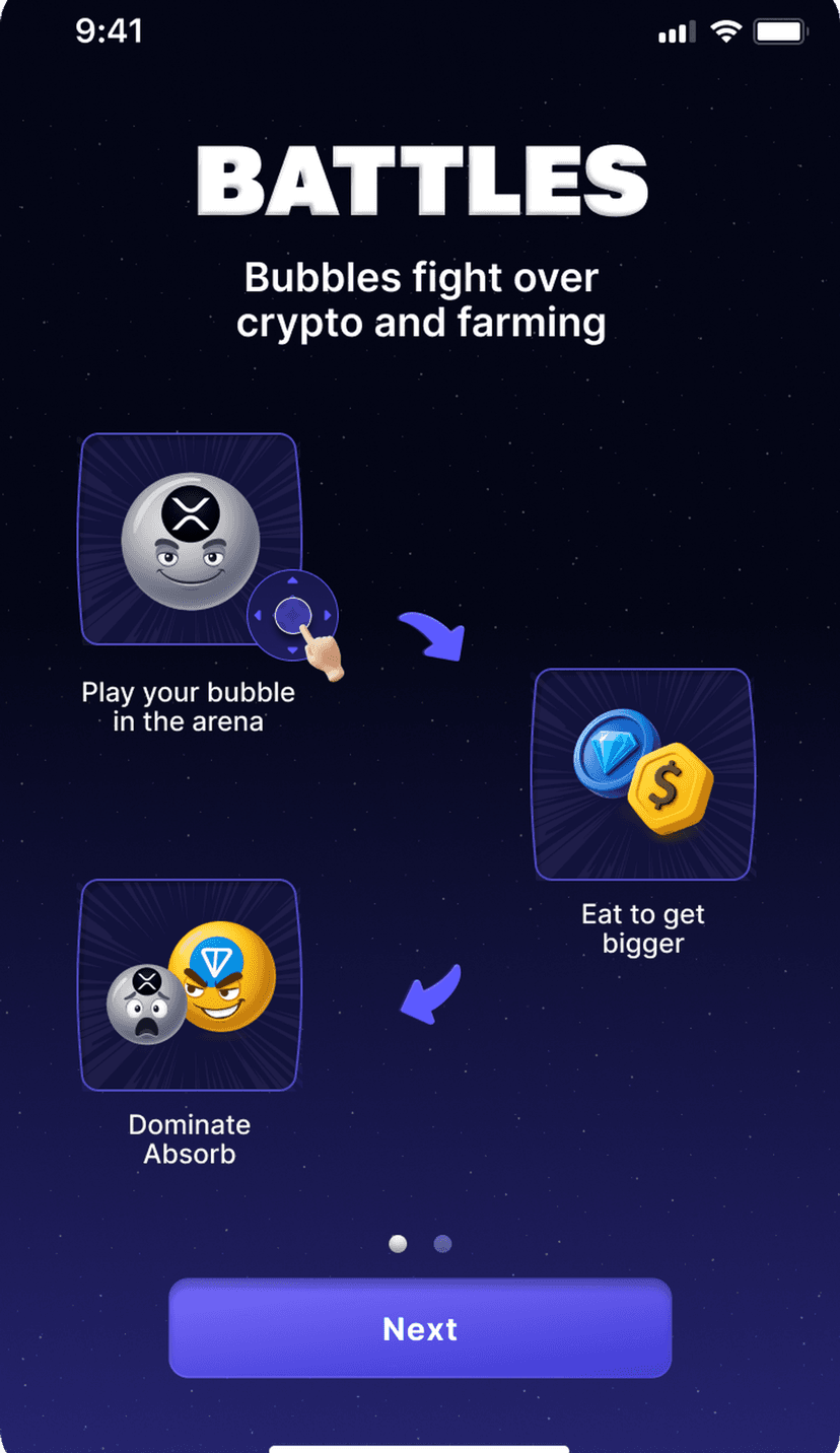 Crybble Wars — динамичная PVP-аркада в стиле io: управляйте виртуальным пузырём, поглощайте более мелких противников, увеличивайтесь и соревнуйтесь за реальные призы в TON.