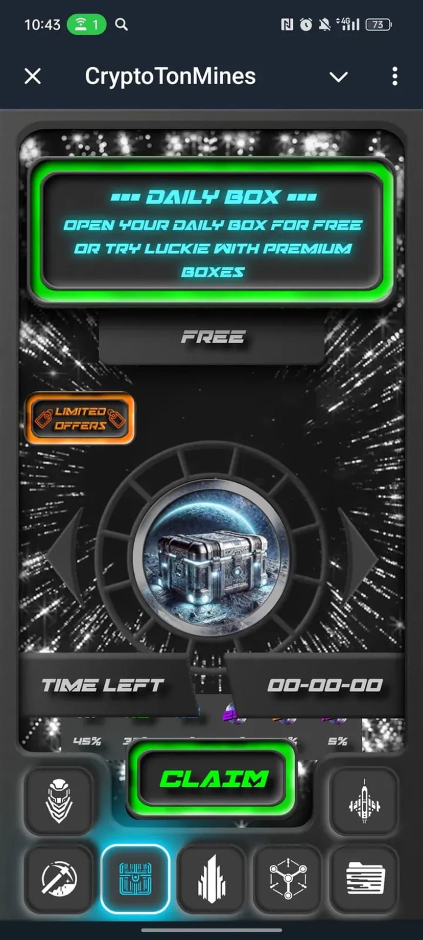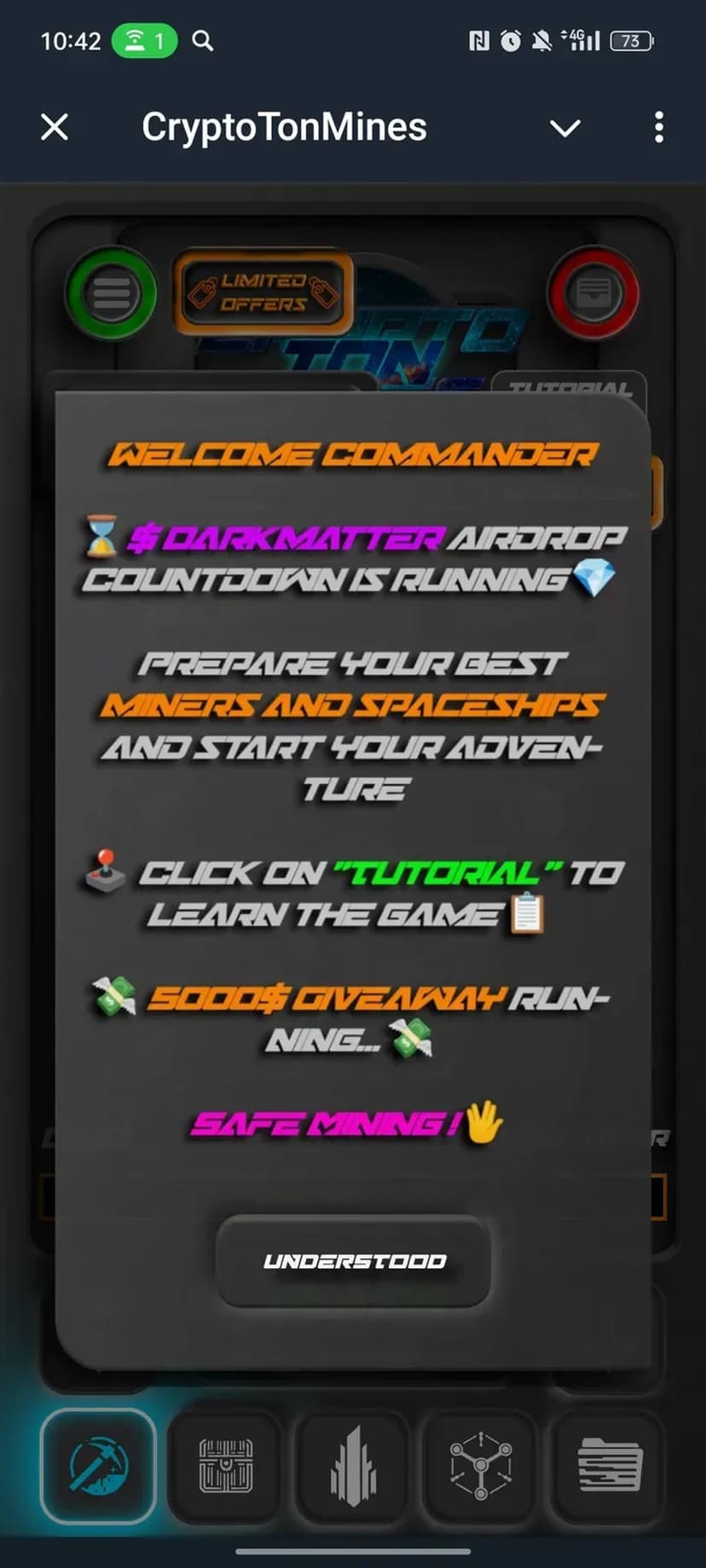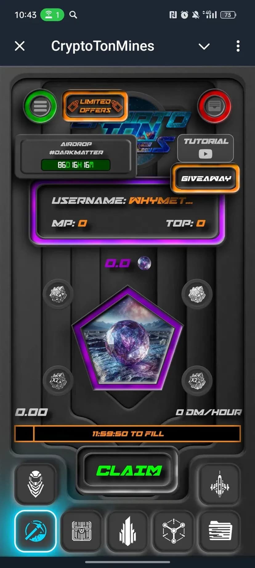 CryptoTonMines — геймифицированный майнинг токена $Darkmatter в экосистеме TON. Игроки комплектуют команды майнеров и собирают корабли, чтобы повышать ежедневную добычу, открывают лутбоксы за случайные бонусы и претендуют на участие в крупном airdrop.