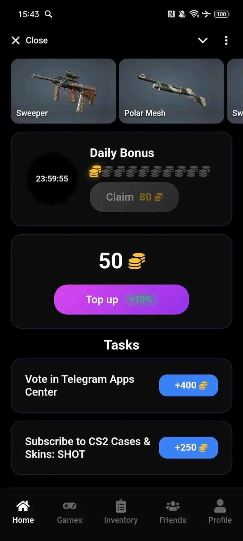 CS2 Cases & Skins: SHOT — открывайте кейсы Counter-Strike 2, получайте скины и управлять ими в простом и быстром интерфейсе.