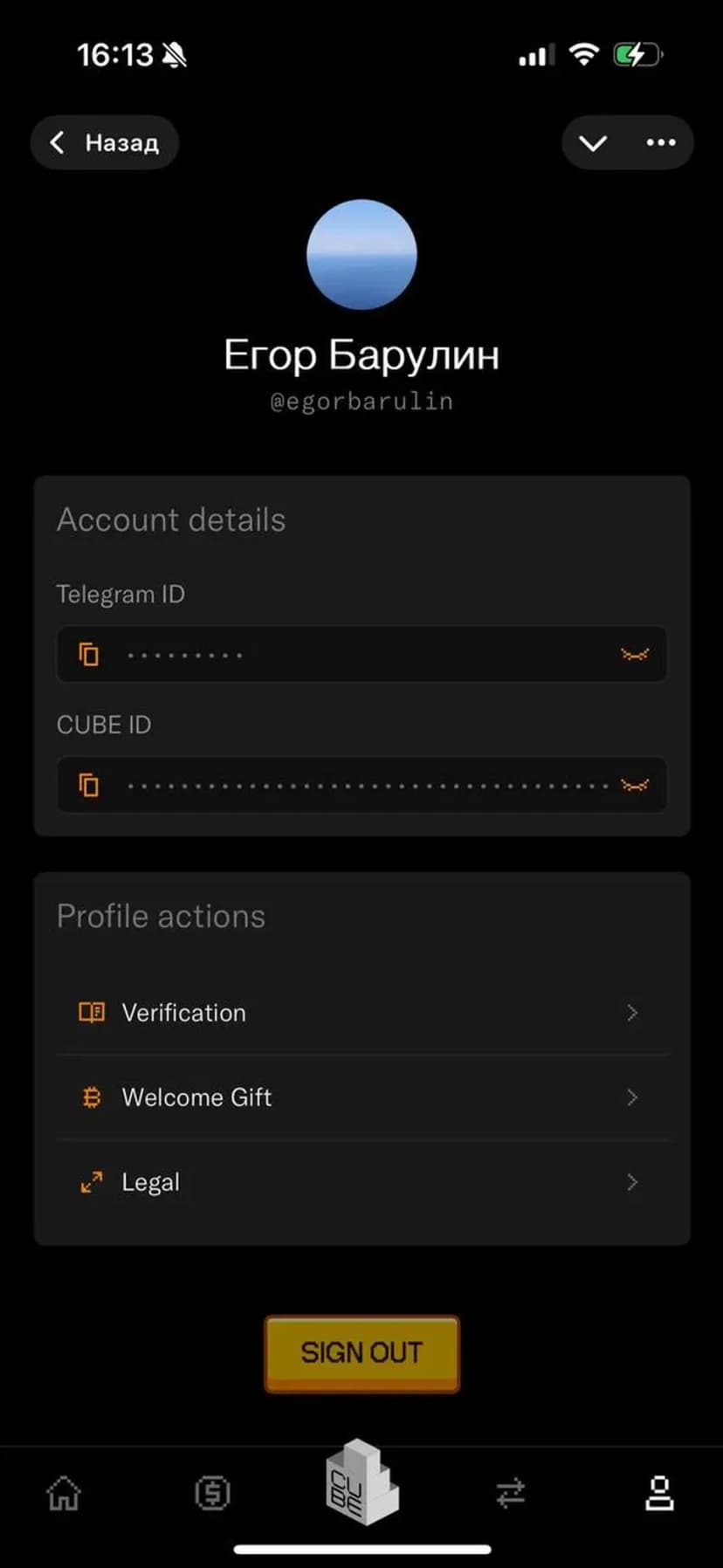 *Нажимая "Открыть в Telegram", вы перейдете к приложению CUBE Exchange Bot в мессенджере Telegram