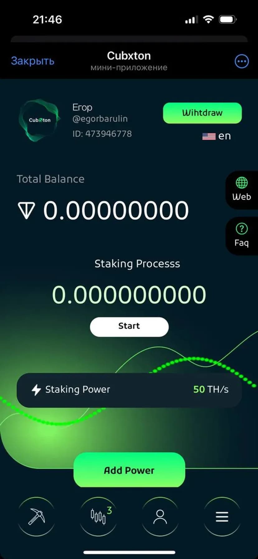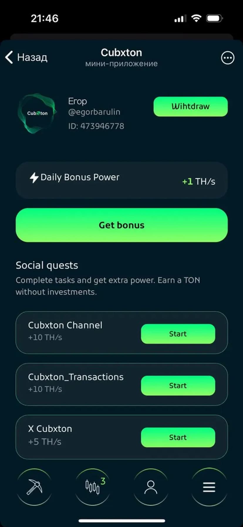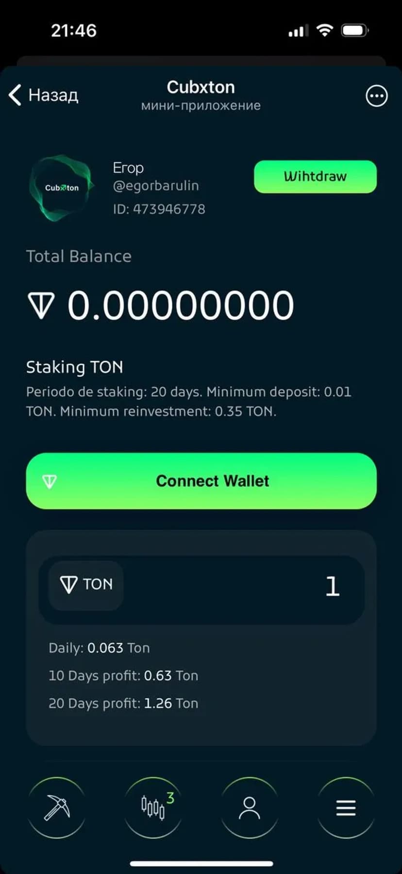 Cubxton — мини‑приложение в Telegram для тех, кто ищет простой способ пассивного дохода через стейкинг. Сервис предлагает гарантированный возврат вложенных средств в размере 100% и фиксированную прибыль 20% за 20 дней с ежедневными выплатами.