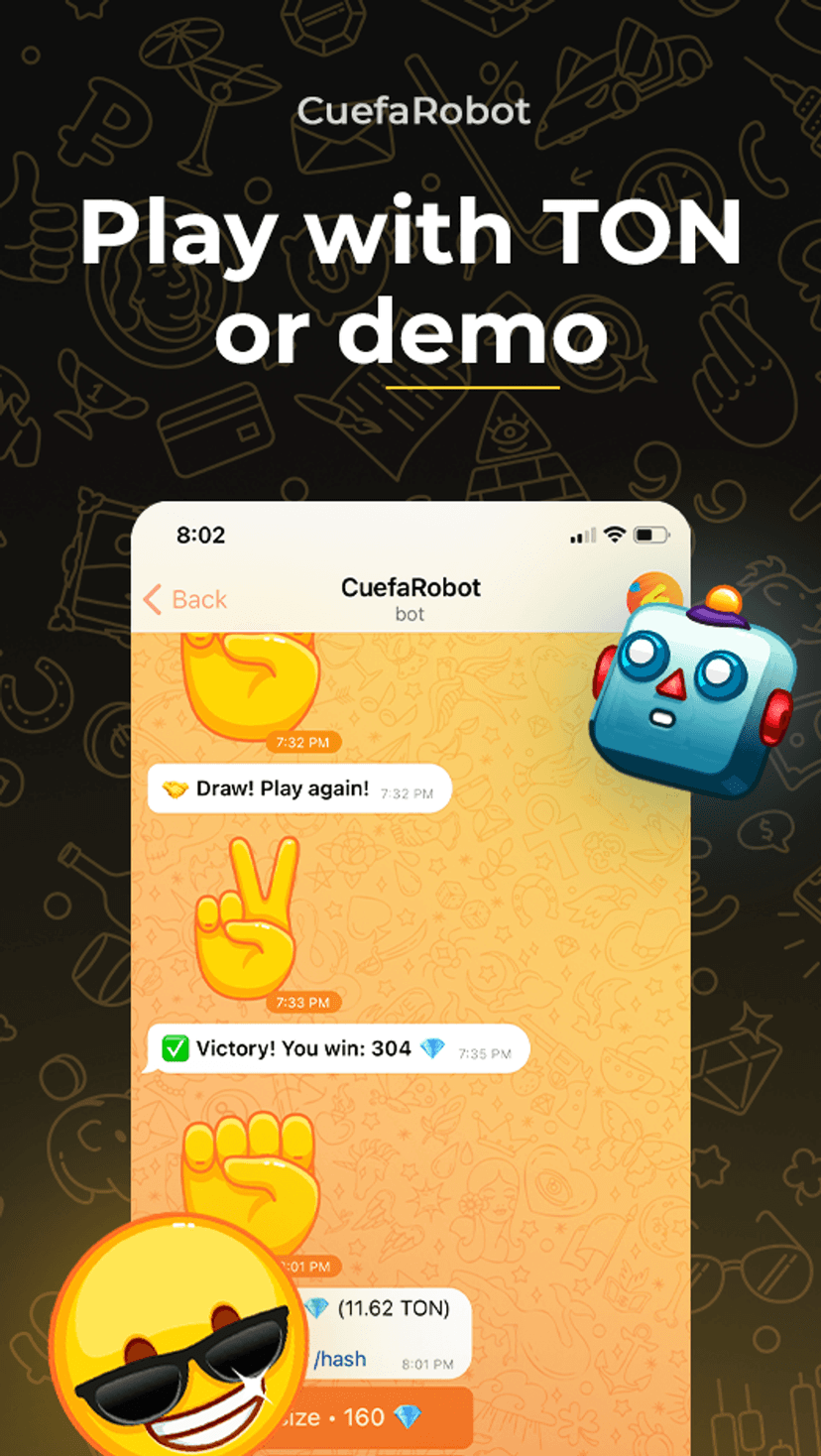 Cuefa Robot предлагает партию «Камень, ножницы, бумага» против бота с возможностью ставок в Toncoin. Доступны демо‑режим для практики и основной режим с реальными ставками. Интерфейс минималистичен: выберите один из трёх ходов и дождитесь ответа робота.