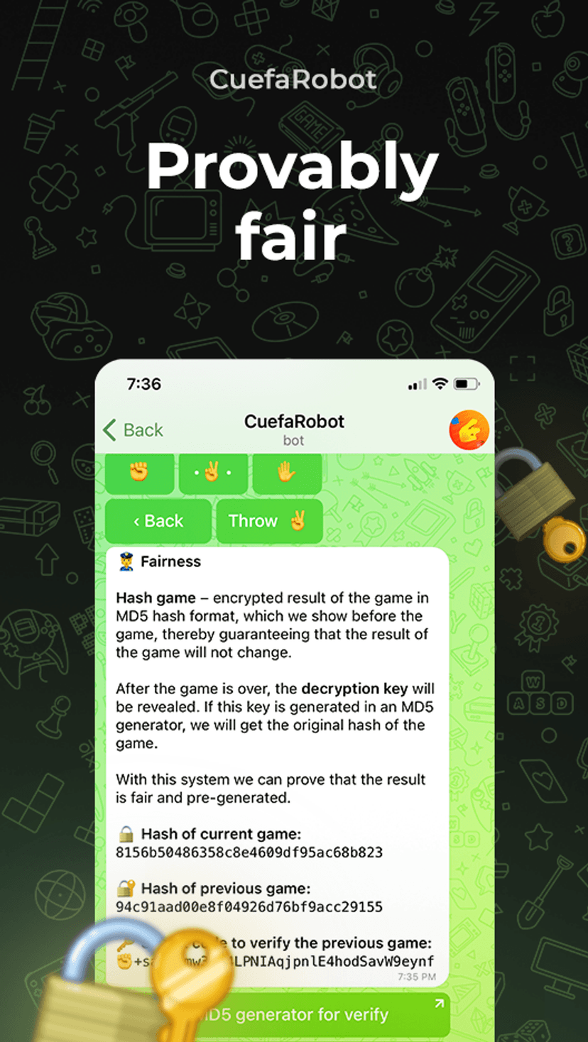 - Provably Fair: каждое действие бота защищено хешированием (MD5) для проверки честности результатов.