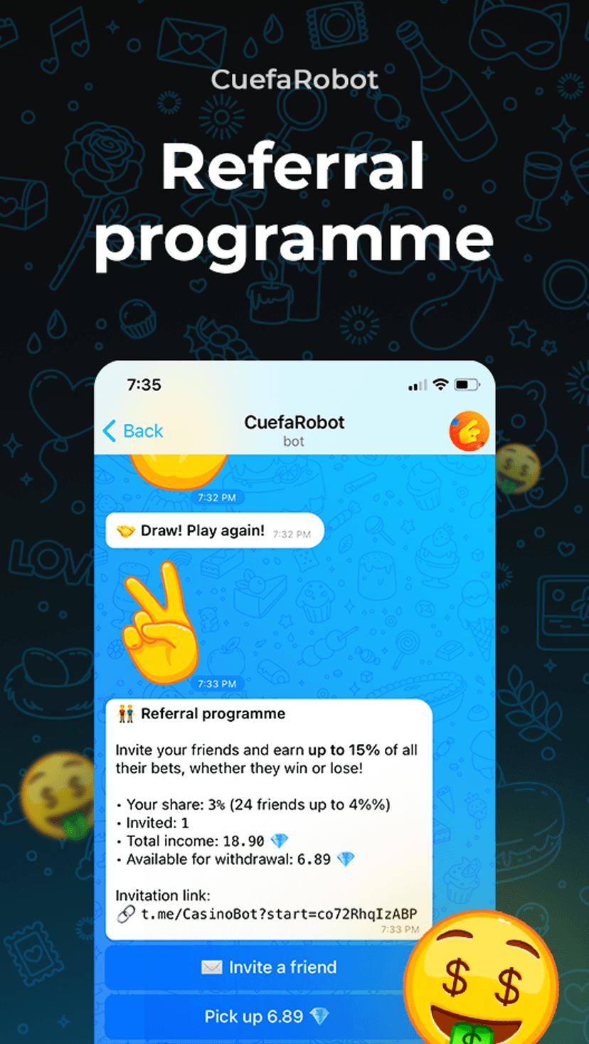 - Партнёрская программа: вознаграждение в виде процента от ставок приглашённых пользователей.