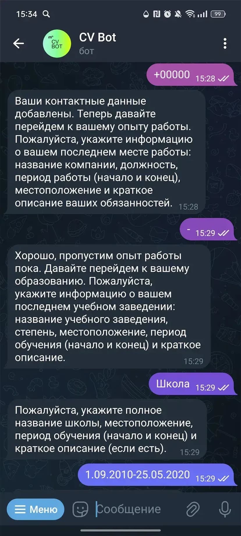 CV Bot собирает резюме пошагово: пользователь вводит контактные данные, опыт работы, образование, навыки и дополнительные сведения, а бот формирует единый документ, пригодный для отправки работодателю.