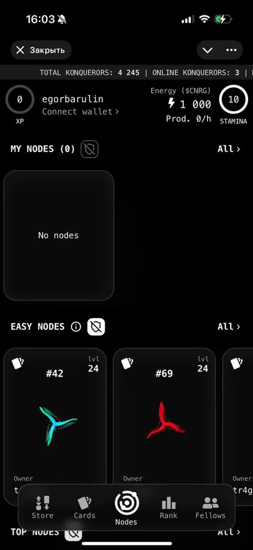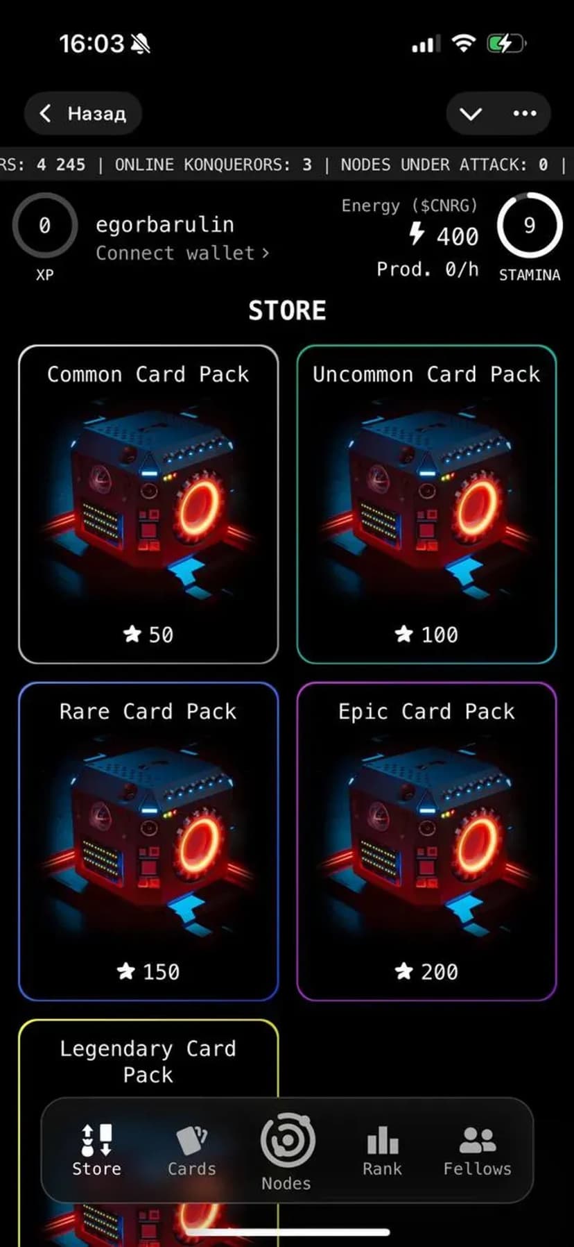 CyberKonquest — стратегическая киберпанк-игра, где вы используете мощность своего устройства, чтобы захватывать узлы в киберпространстве, производить энергию и собирать карты для тактических ходов. Игра работает прямо в мессенджере без отдельной установки и сочетает PvP-соперничество с коллекционной механикой.