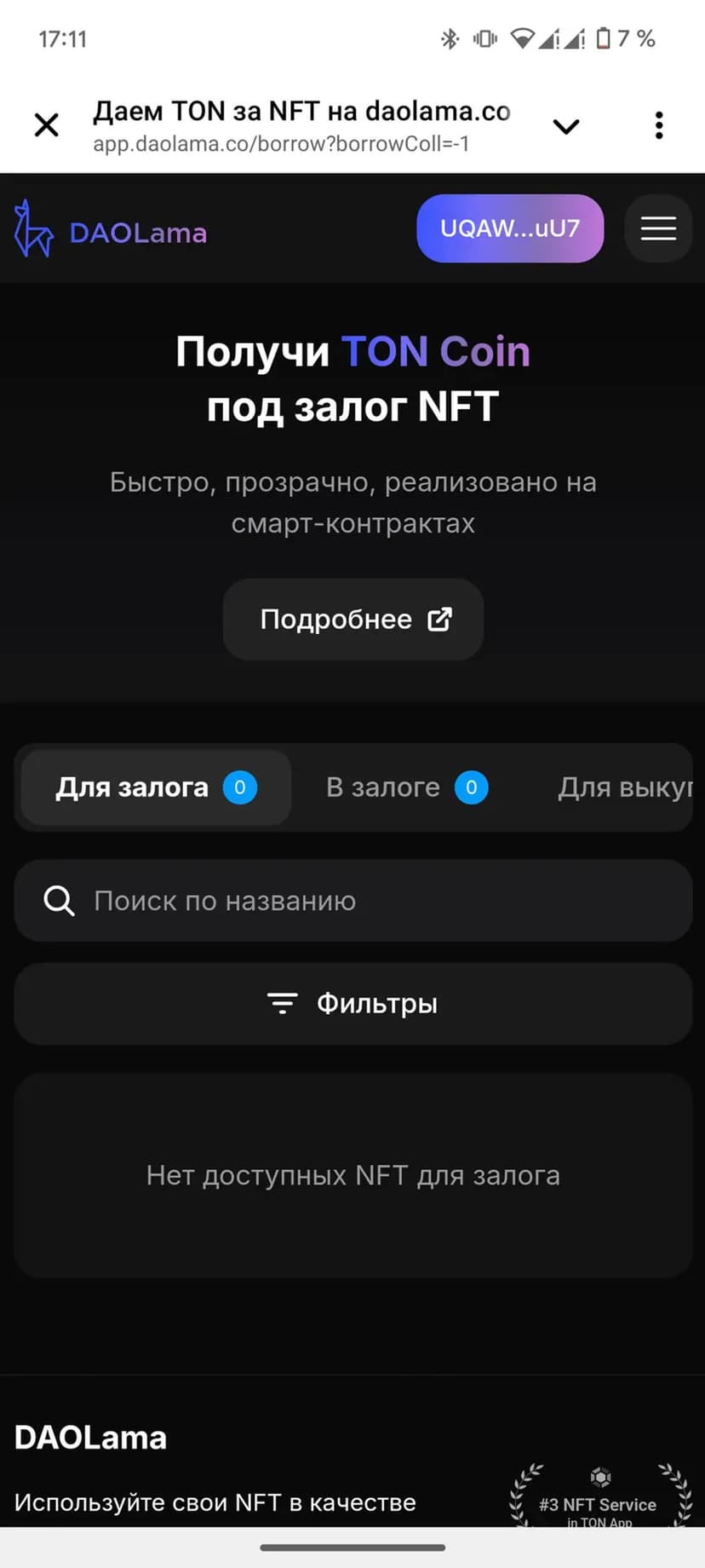 DAOLama — протокол для NFT-кредитования в экосистеме TON. Пользователи подключают кошелёк и используют свои NFT как обеспечение для получения кредита в криптовалюте.
