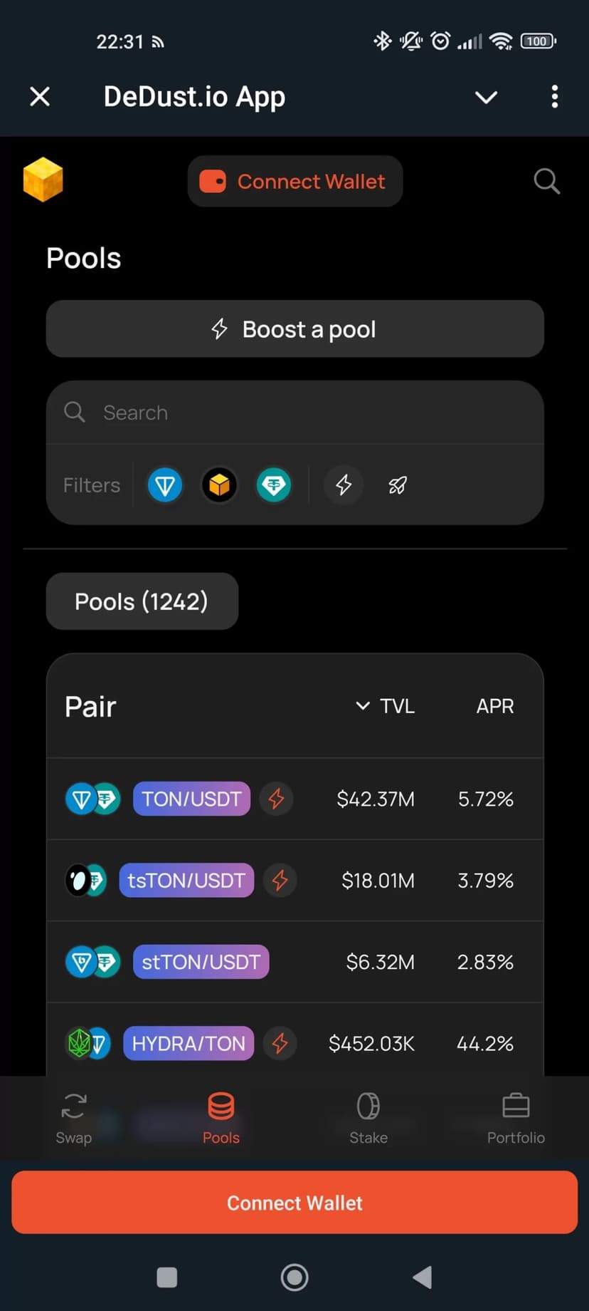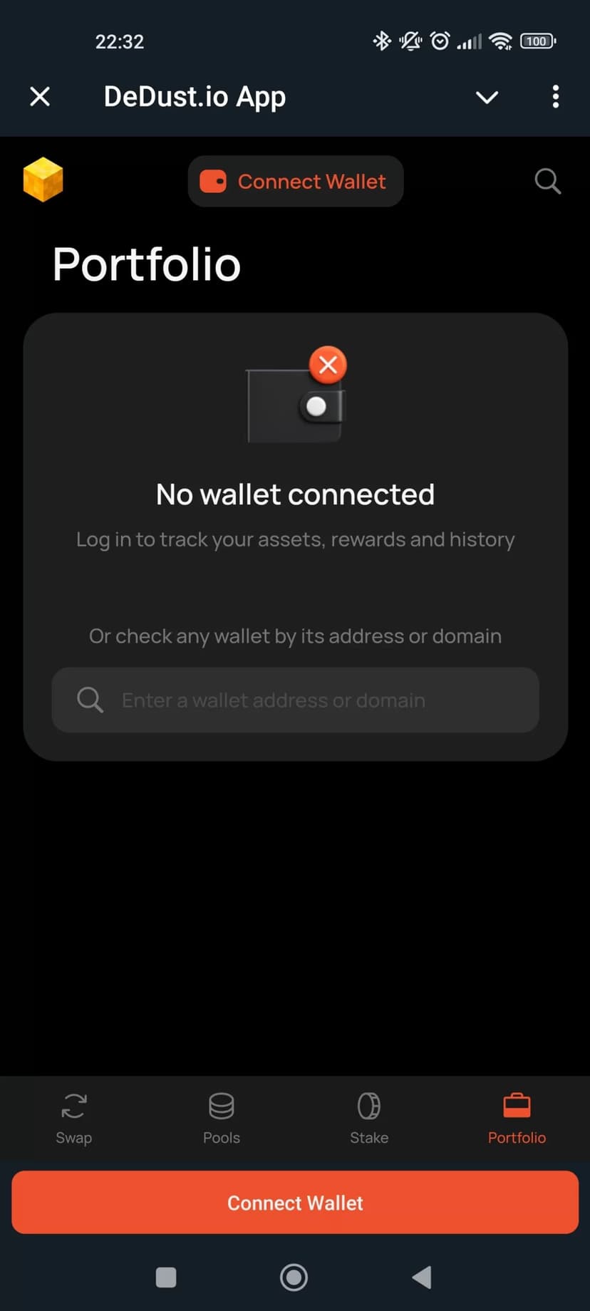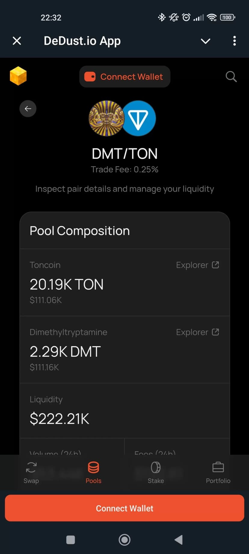 Для работы с DeDust io требуется подключение TON‑кошелька; в интерфейсе доступны отслеживание активов, обмены и участие в пулах ликвидности.