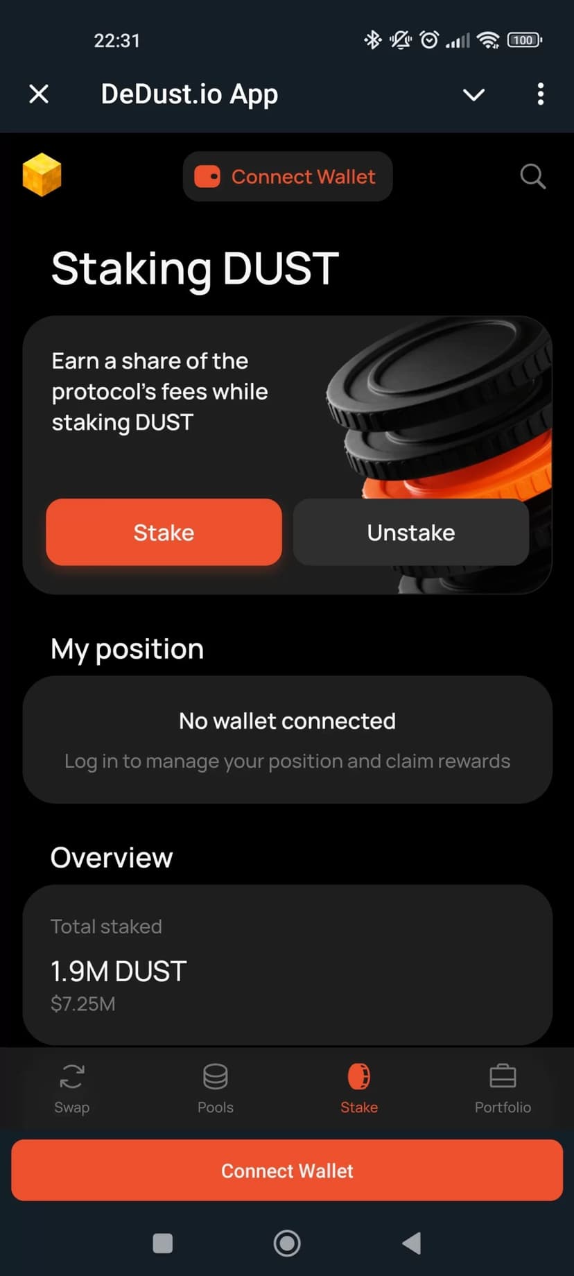 - Стейкинг — стейкинг токена $SCALE (позже $DUST) с вознаграждениями, формируемыми торговыми комиссиями.