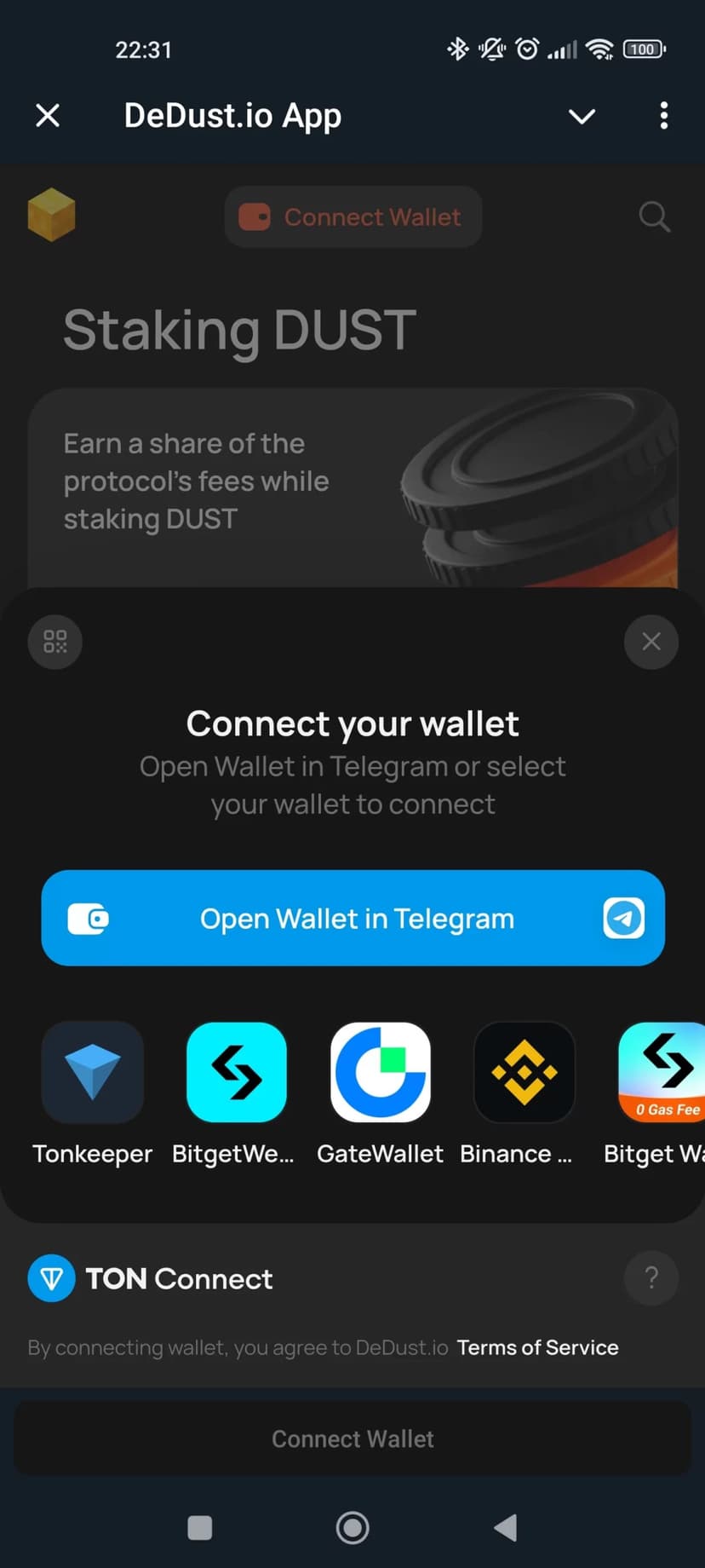 *Нажимая "Открыть в Telegram", вы перейдете к приложению DeDust io в мессенджере Telegram