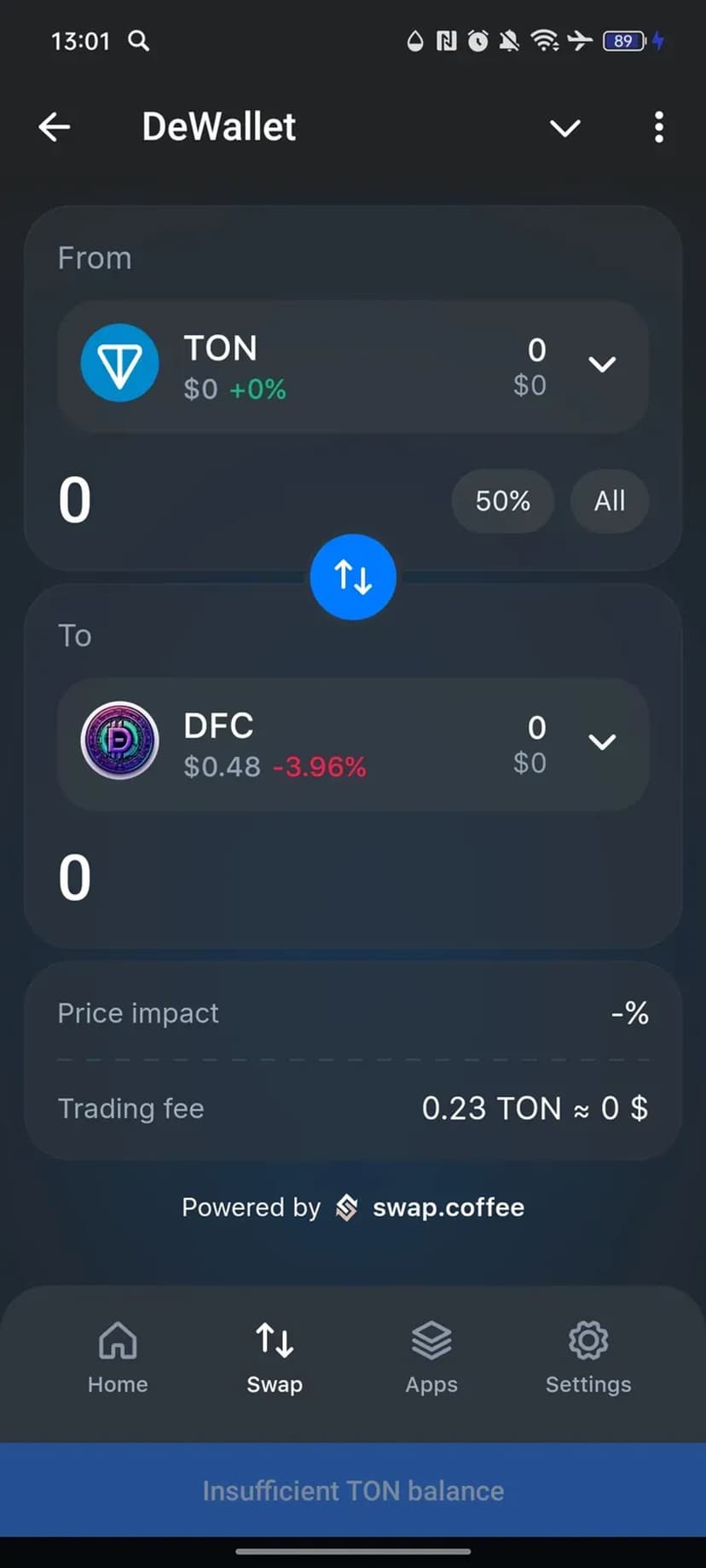 DeWallet — некастодиальный криптокошелёк на базе TON, работающий внутри Telegram. Позволяет хранить, отправлять и получать токены TON, при этом приватные ключи остаются только на устройстве пользователя. Встроенный обменник выполняет свопы напрямую на блокчейне TON, что обеспечивает быстрые и недорогие операции без выхода из интерфейса.