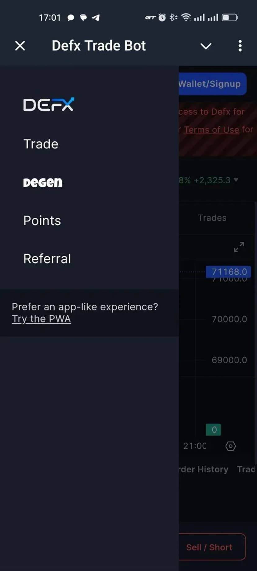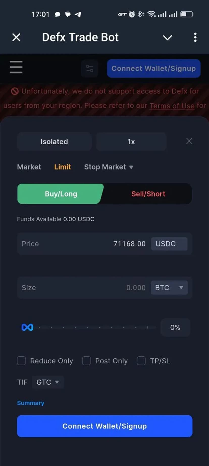 Defx - Trade Perps позволяет торговать бессрочными деривативами (perps) не выходя из мессенджера. Подключение криптокошелька осуществляется через WalletConnect, что повышает безопасность и сохраняет анонимность операций.