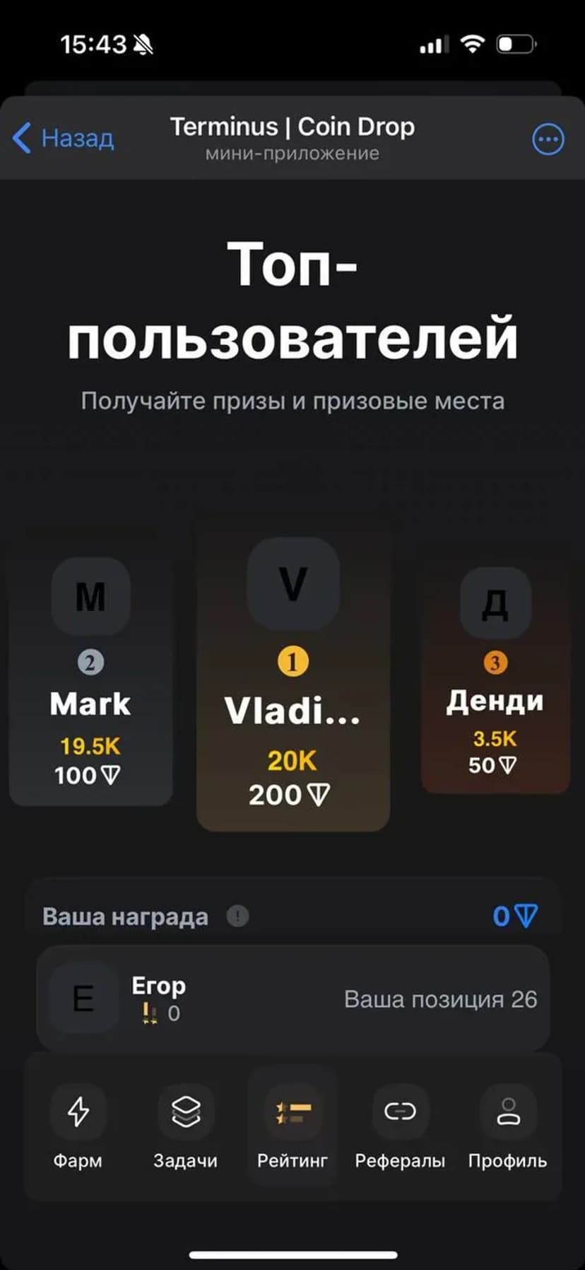 Terminus DEX — мини‑приложение в Telegram, объединяющее игровые механики с элементами децентрализованной биржи. Пользователи выполняют задания и участвуют в игровых активностях, за что получают утилитарные токены, планируемые к интеграции в будущую платформу.