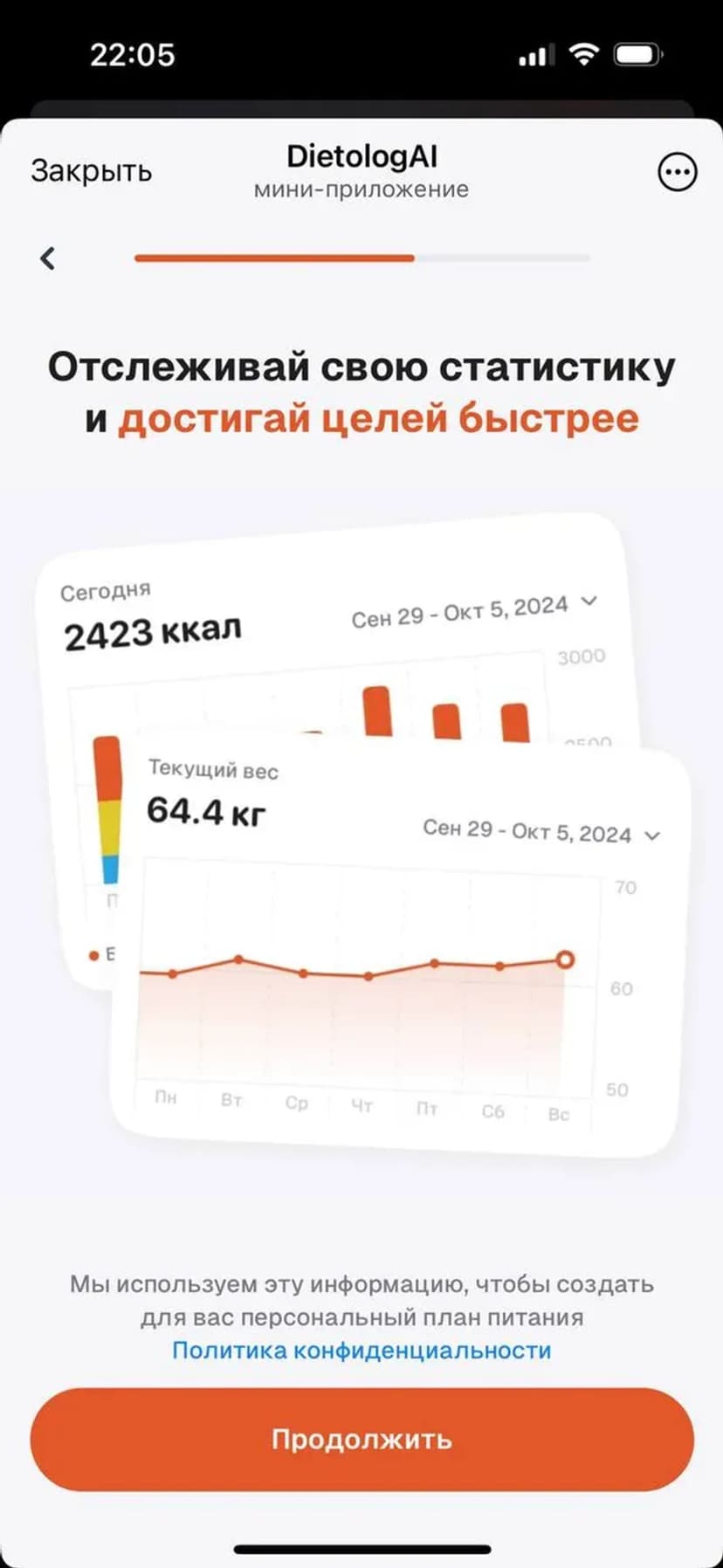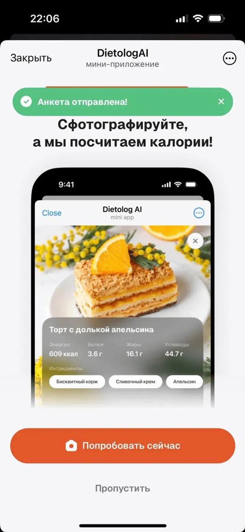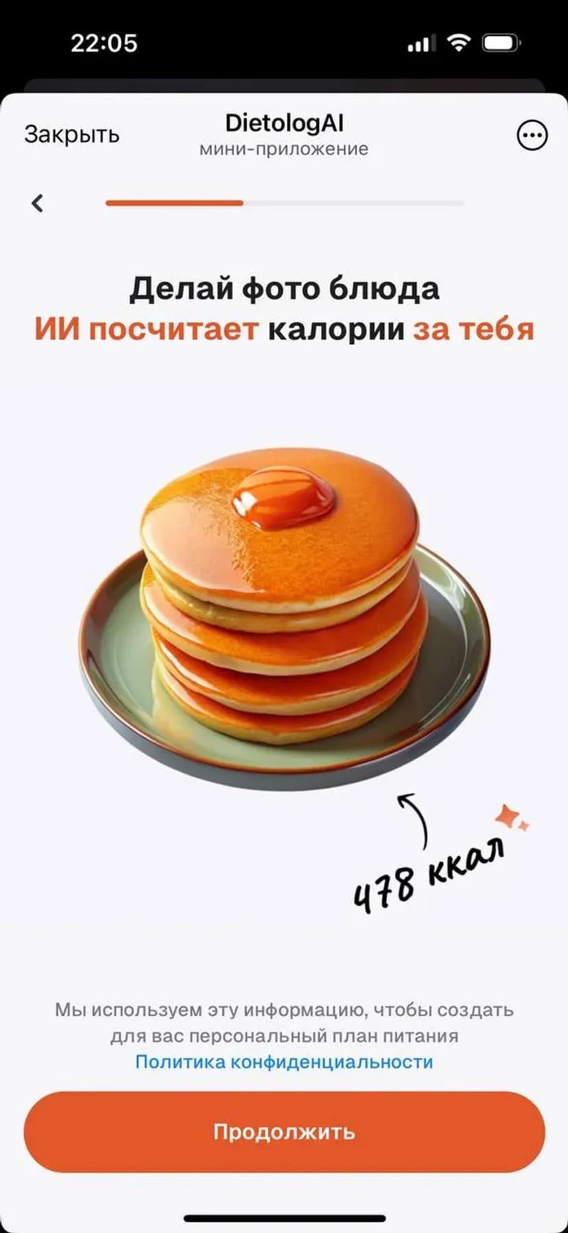*Нажимая "Открыть в Telegram", вы перейдете к приложению Диетолог - трекер калорий в мессенджере Telegram