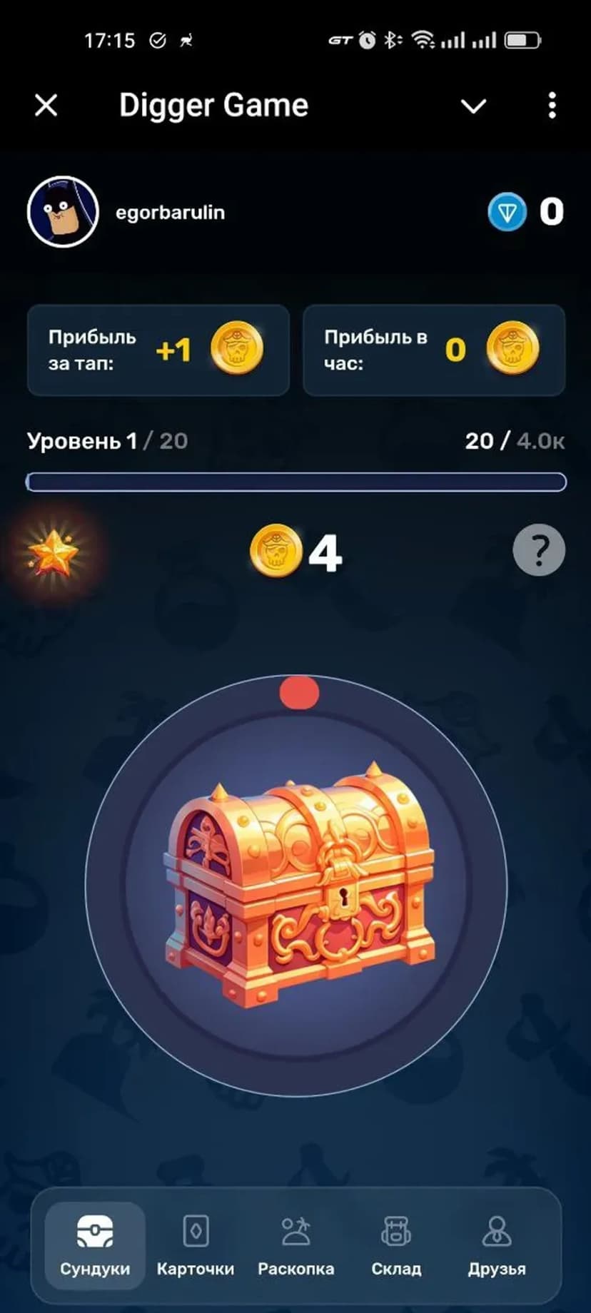 - Tap-to-earn: нажимайте на экран, чтобы копать сундуки и добывать монеты.