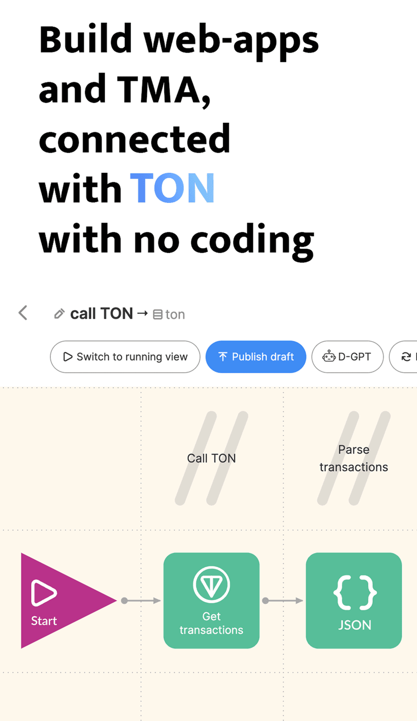 Directual no-code — платформа для создания веб‑приложений, Telegram‑мини‑приложений и чат‑ботов без программирования. Позволяет формировать сложную логику в визуальном редакторе и подключать внешние сервисы и блокчейн‑функции.