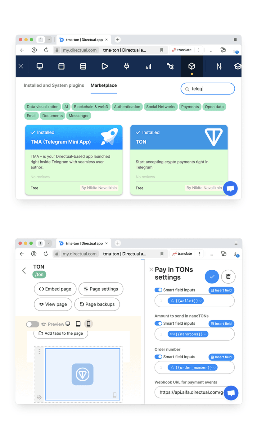 *Нажимая "Открыть в Telegram", вы перейдете к приложению Directual no-code в мессенджере Telegram