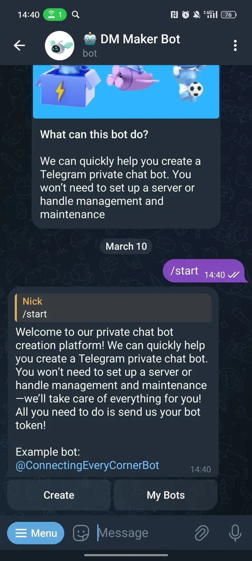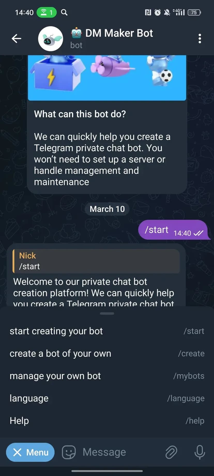 π€ DM Maker Bot ΠΏΠΎΠ·Π²ΠΎΠ»ΡΠ΅Ρ Π±ΡΡΡΡΠΎ Π·Π°ΠΏΡΡΠΊΠ°ΡΡ ΠΏΡΠΈΠ²Π°ΡΠ½ΡΠ΅ ΡΠ°ΡβΠ±ΠΎΡΡ Π² Telegram Π±Π΅Π· Π½Π΅ΠΎΠ±Ρ ΠΎΠ΄ΠΈΠΌΠΎΡΡΠΈ ΡΠ°Π·Π²ΠΎΡΠ°ΡΠΈΠ²Π°ΡΡ ΠΈ ΠΏΠΎΠ΄Π΄Π΅ΡΠΆΠΈΠ²Π°ΡΡ ΡΠΎΠ±ΡΡΠ²Π΅Π½Π½ΡΠ΅ ΡΠ΅ΡΠ²Π΅ΡΡ. Π‘Π΅ΡΠ²ΠΈΡ ΠΏΠΎΠ΄Ρ ΠΎΠ΄ΠΈΡ Π΄Π»Ρ ΠΏΠ΅ΡΡΠΎΠ½Π°Π»ΡΠ½ΡΡ ΠΏΠΎΠΌΠΎΡΠ½ΠΈΠΊΠΎΠ², ΡΠ΅ΡΡΠΈΡΠΎΠ²Π°Π½ΠΈΡ ΠΈ Π°Π²ΡΠΎΠΌΠ°ΡΠΈΠ·Π°ΡΠΈΠΈ Π»ΠΈΡΠ½ΡΡ Π·Π°Π΄Π°Ρ.