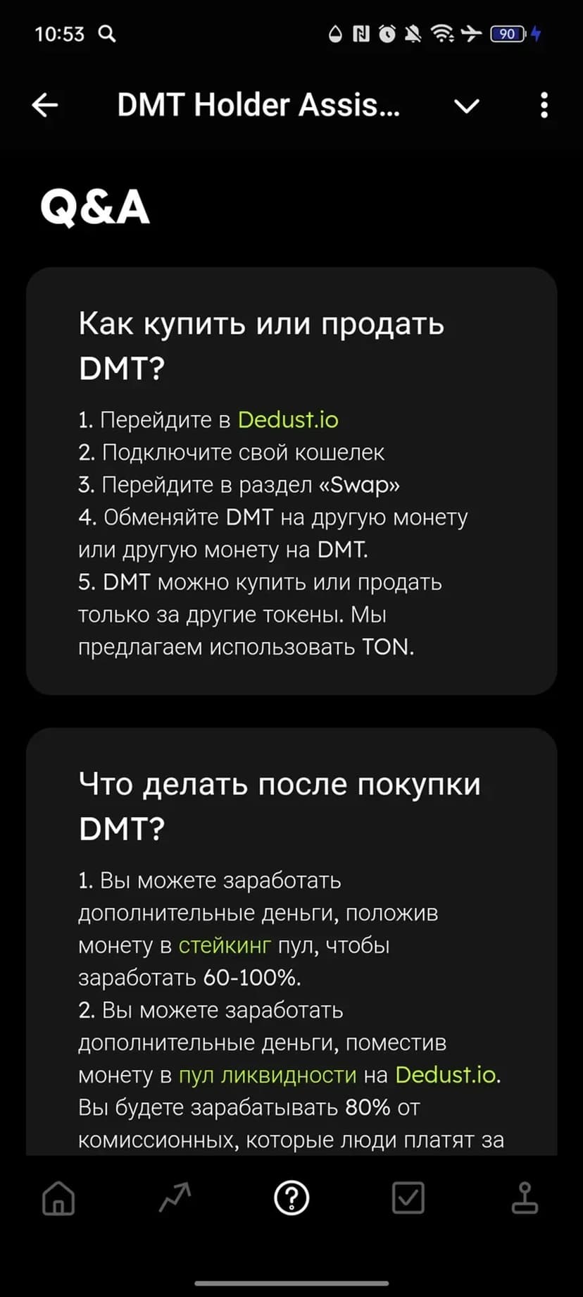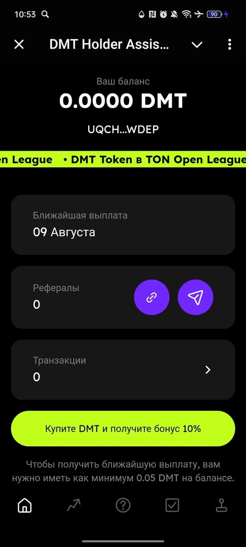 - Удобное меню: быстрый доступ к балансу DMT, истории транзакций, условиям участия в комьюнити и анонсам.