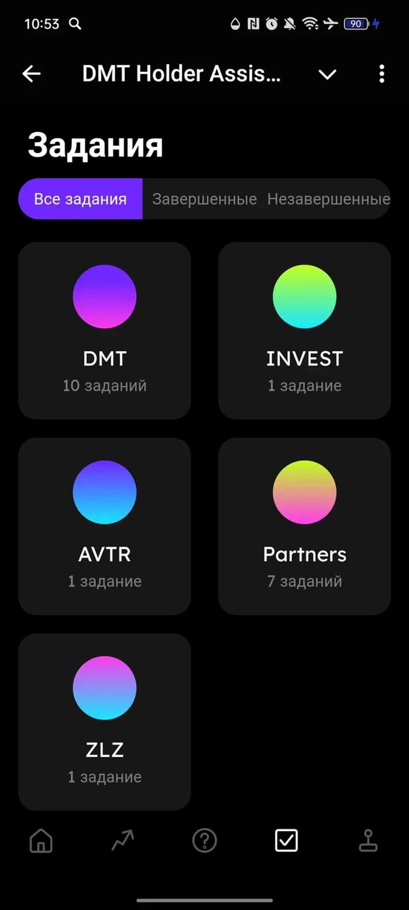 - Уведомления: push-оповещения о начислениях, изменениях статуса и других важных событиях экосистемы DMT.