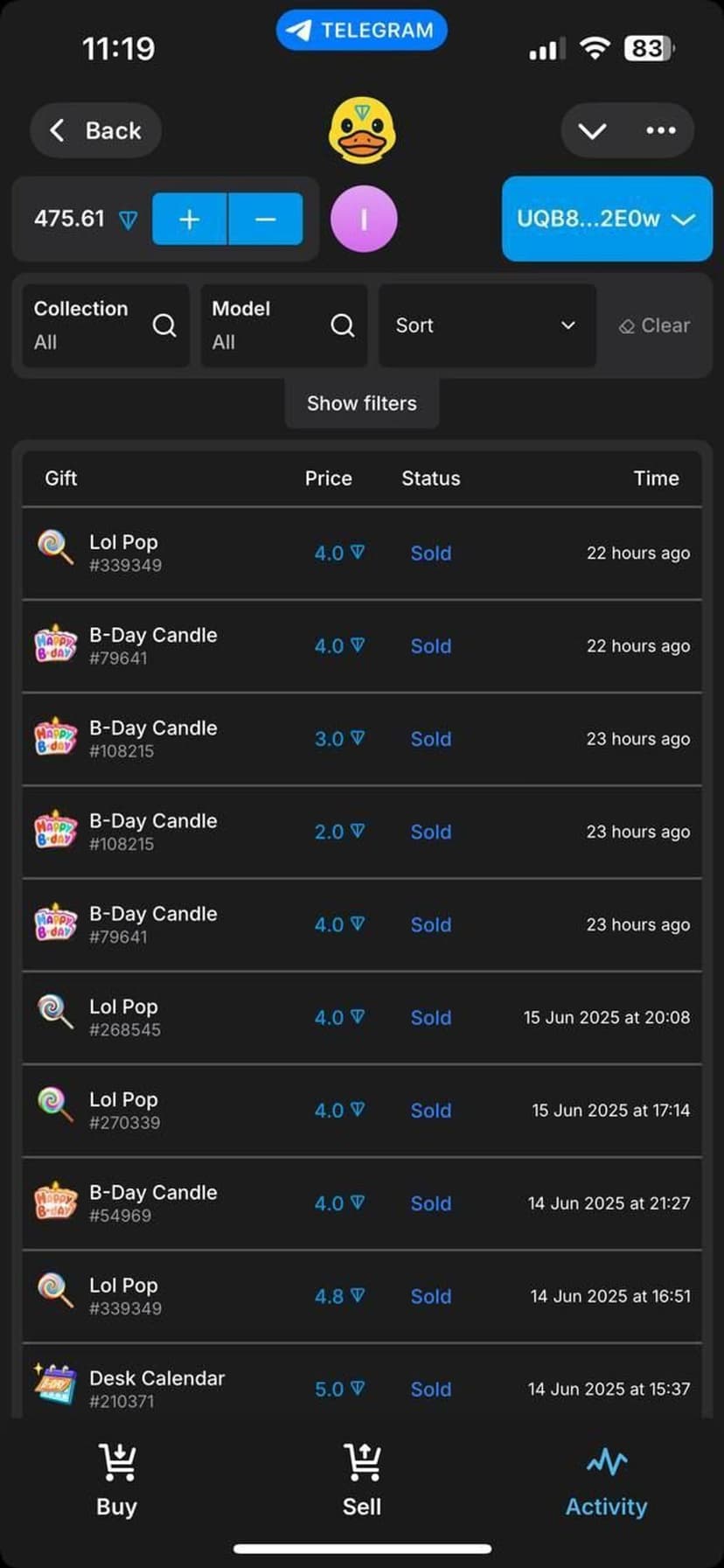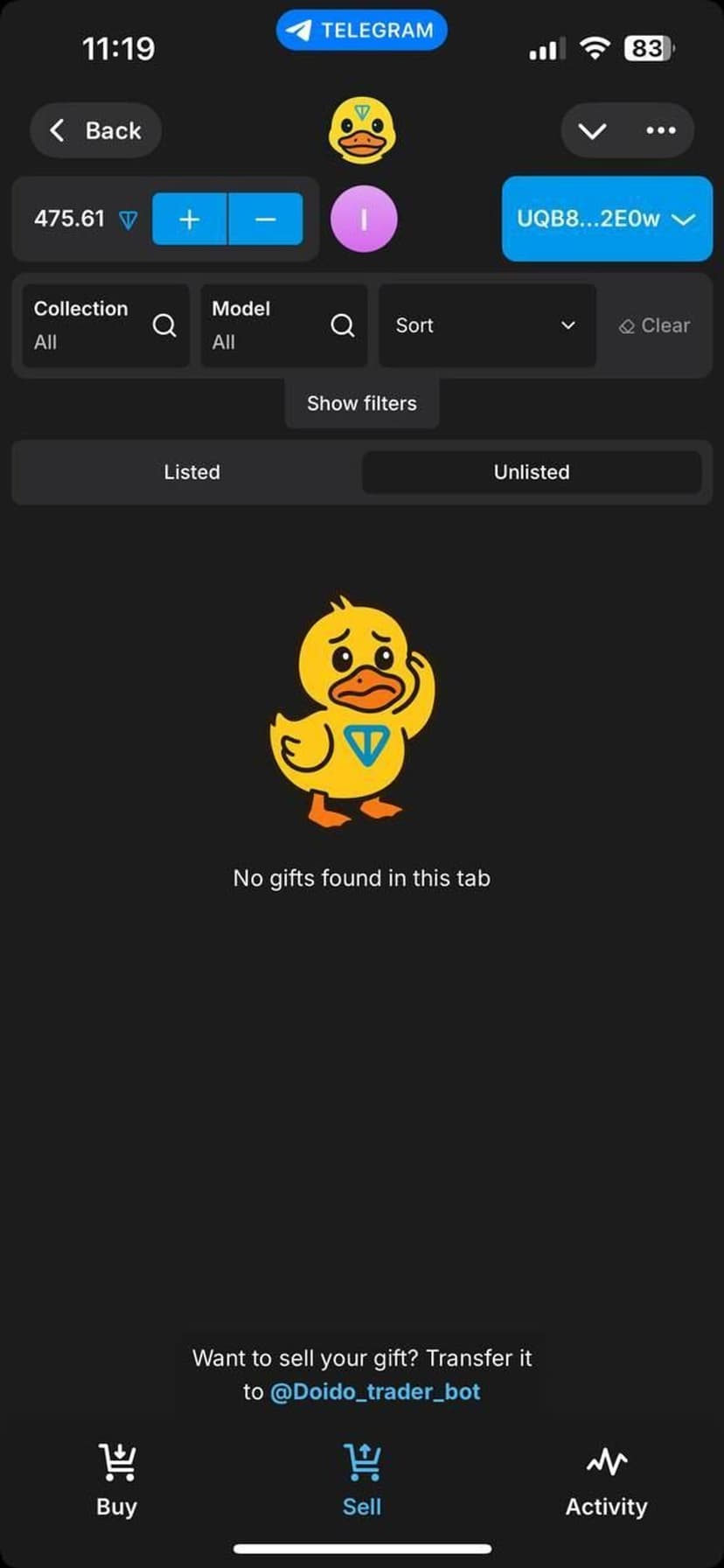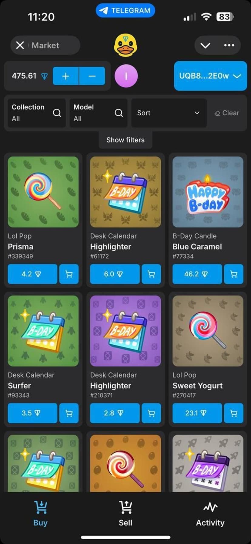 - Удобство: быстрая регистрация и торговля без выхода из Telegram, встроенные фильтры для поиска нужных подарков.