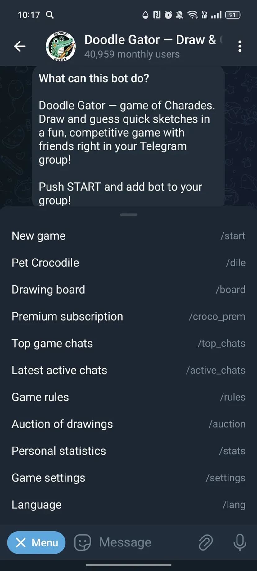Doodle Gator — Draw & Guess charades — игра для групповых чатов, где игроки по очереди рисуют загаданное слово, а остальные в реальном времени отправляют свои догадки в общий чат.