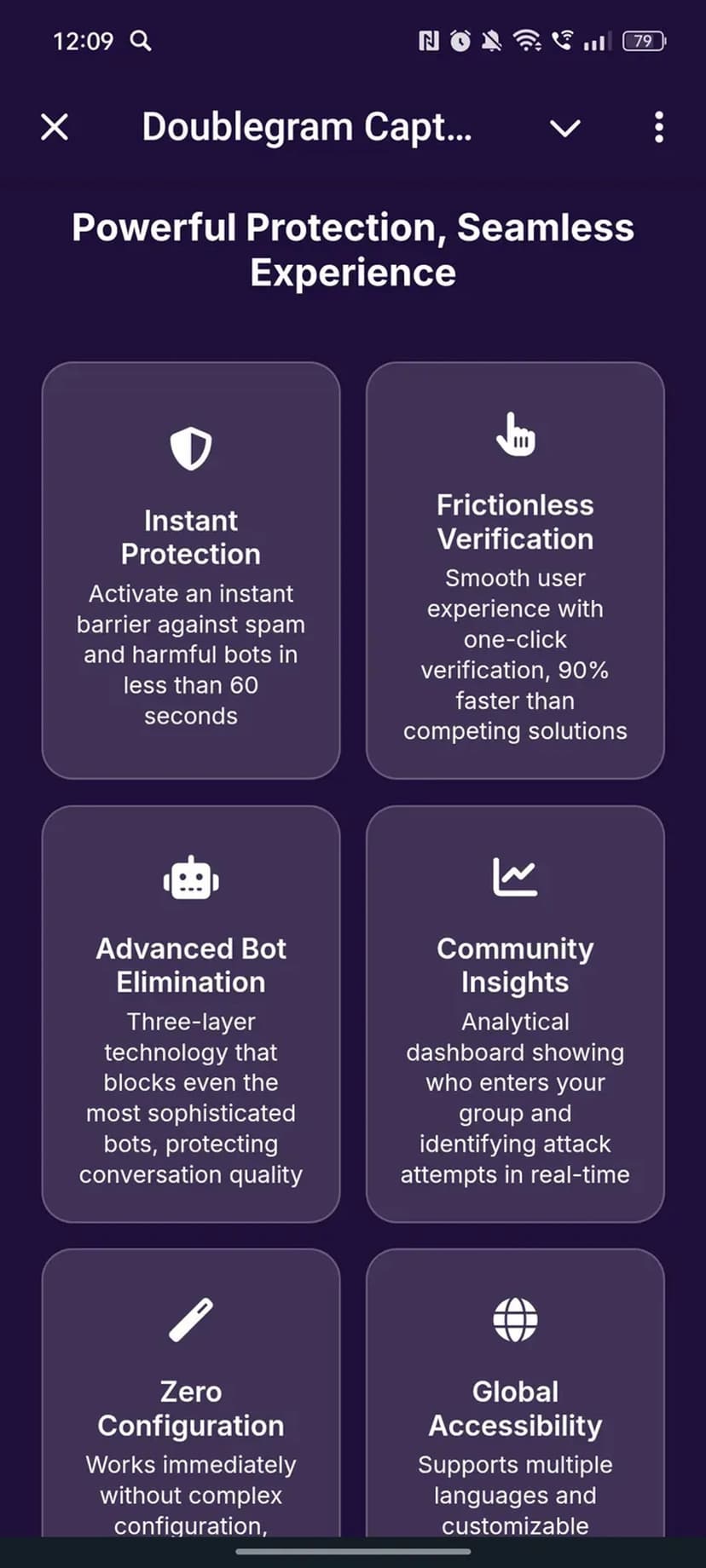 Doublegram Captcha автоматически защищает группы от спама и нежелательных аккаунтов: новые участники получают ограниченные права и должны пройти простую проверку-капчу, после успешного прохождения права восстанавливаются.