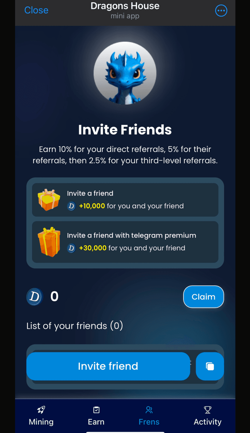 Dragons House — геймифицированный сервис внутри Telegram, где через открытие Dragon's Boxes можно получать токен $DHT и другие цифровые награды. Интерфейс простой и минималистичный, все взаимодействие происходит в рамках Telegram Web Apps без отдельной установки.