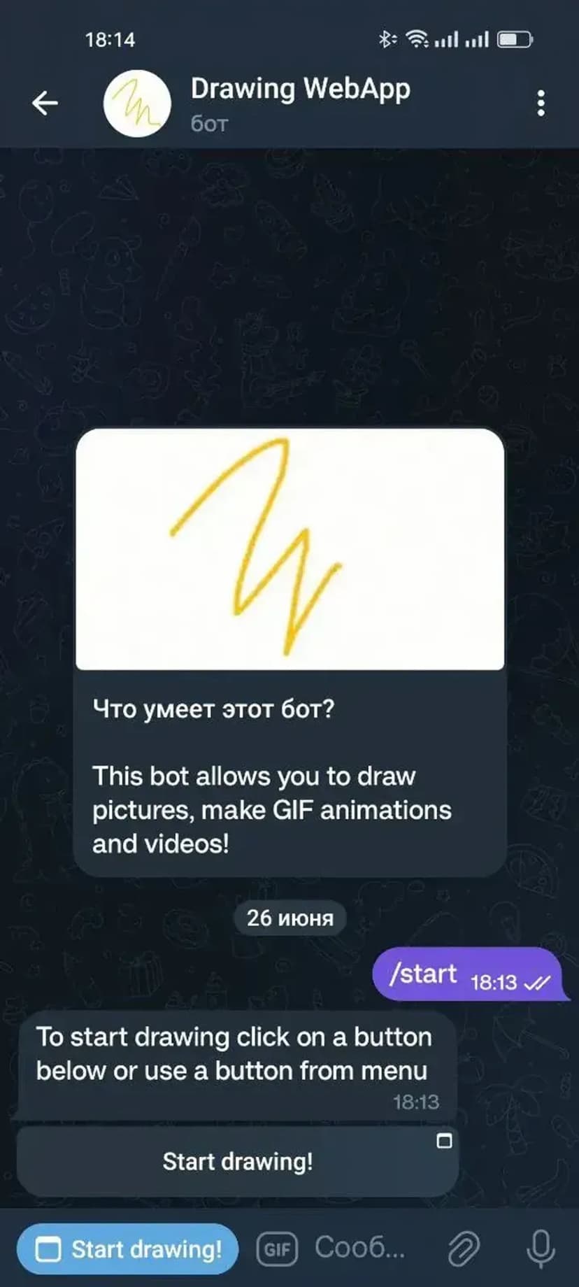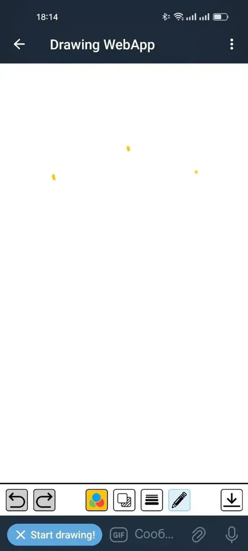 Drawing WebApp позволяет рисовать, собирать кадры для анимации и экспортировать результат в GIF или видеофайл прямо в чате Telegram. При первом запуске открывается рабочее поле с инструментами рисования и панелью выбора кистей и цветов.