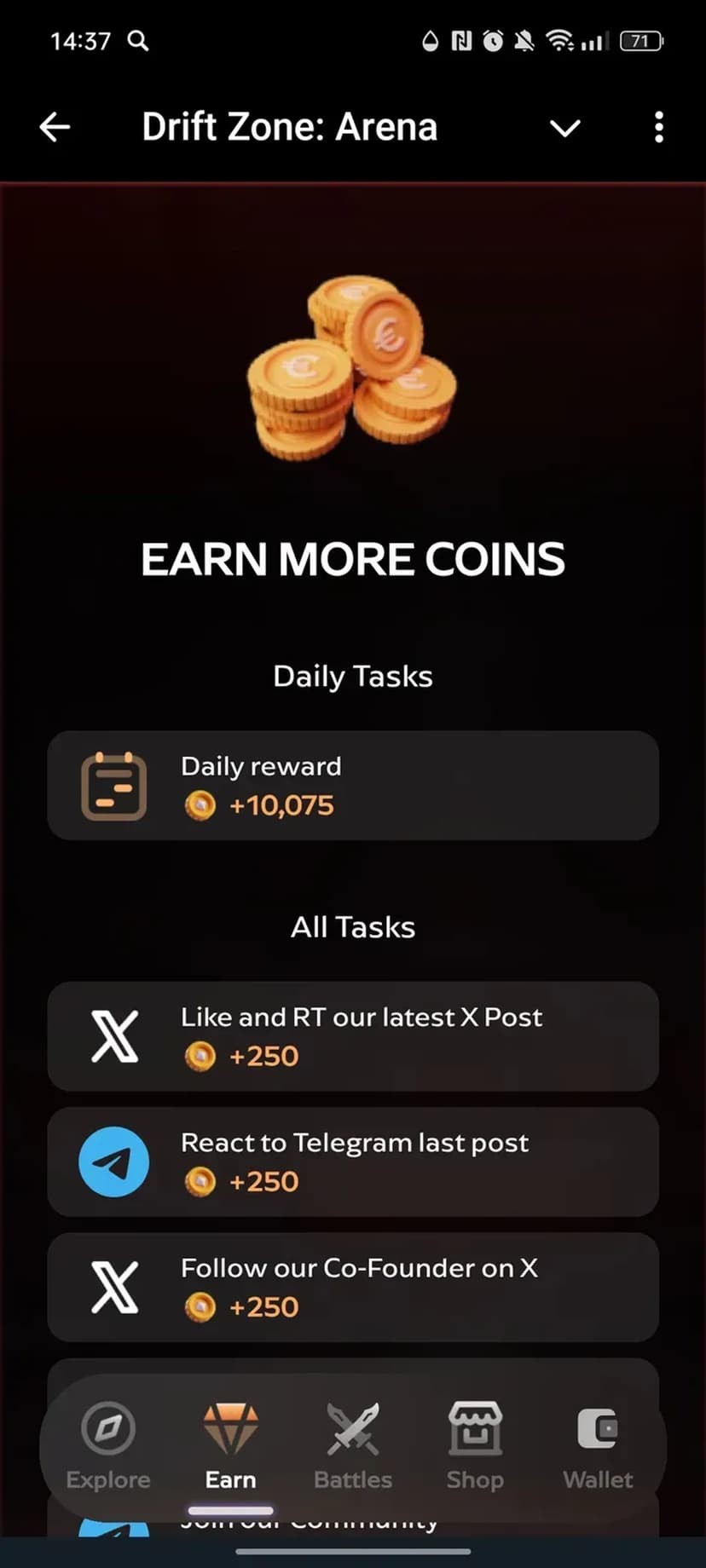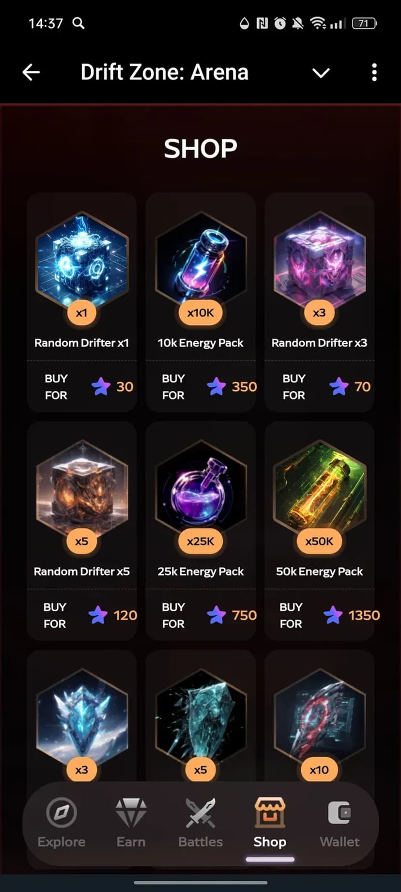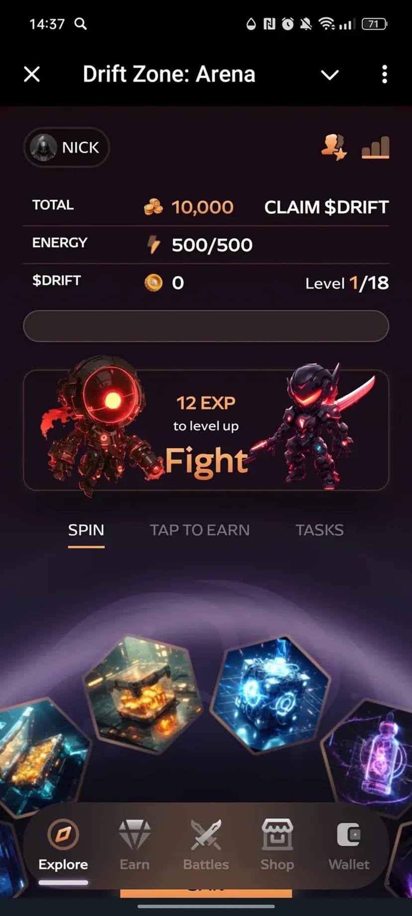Drift Zone: Arena сочетает кликер и коллекционирование с быстрыми PvP-сражениями в реальном времени. Пользователи получают бесплатного персонажа — «Дрифтера», которого можно развивать, выполнять миссии и зарабатывать внутриигровую валюту $DT для повышения в рейтинге.