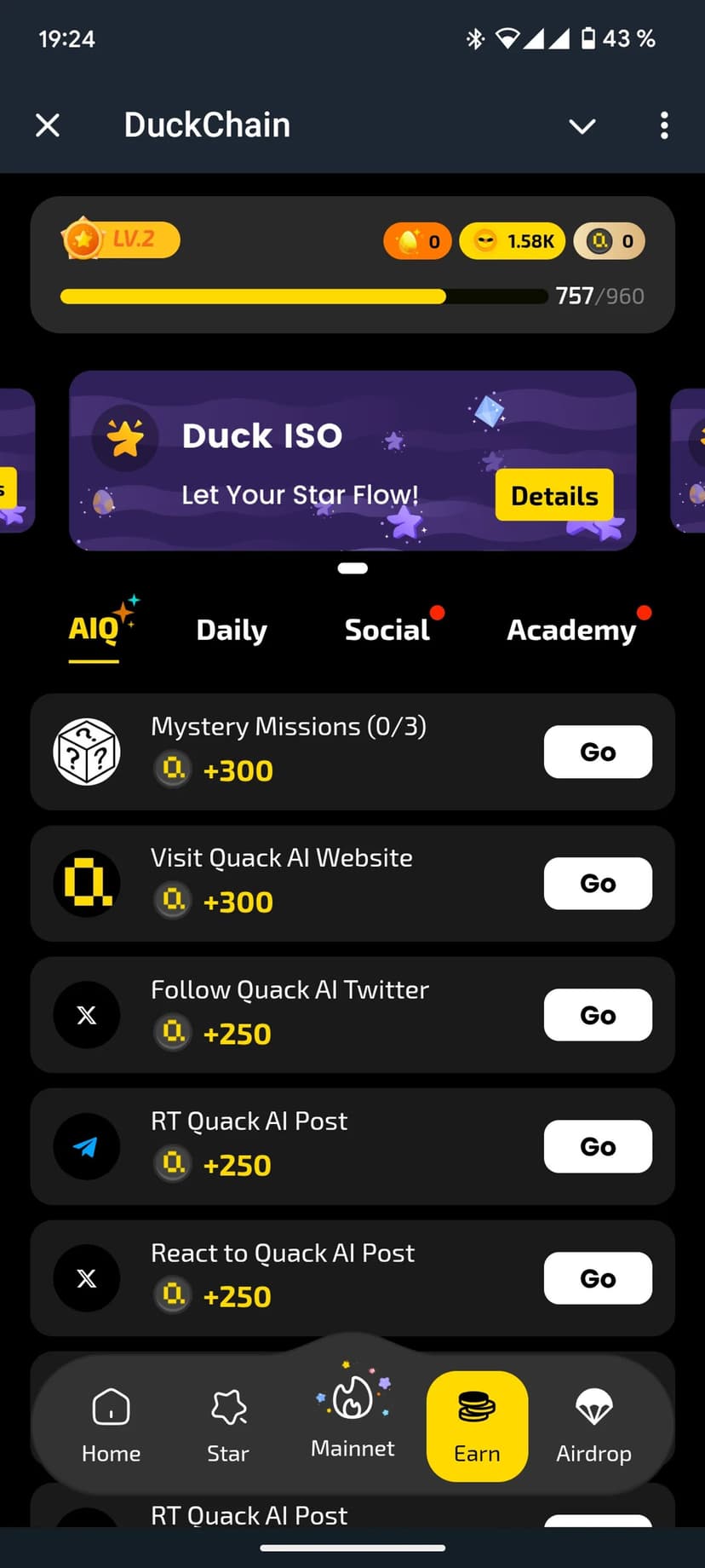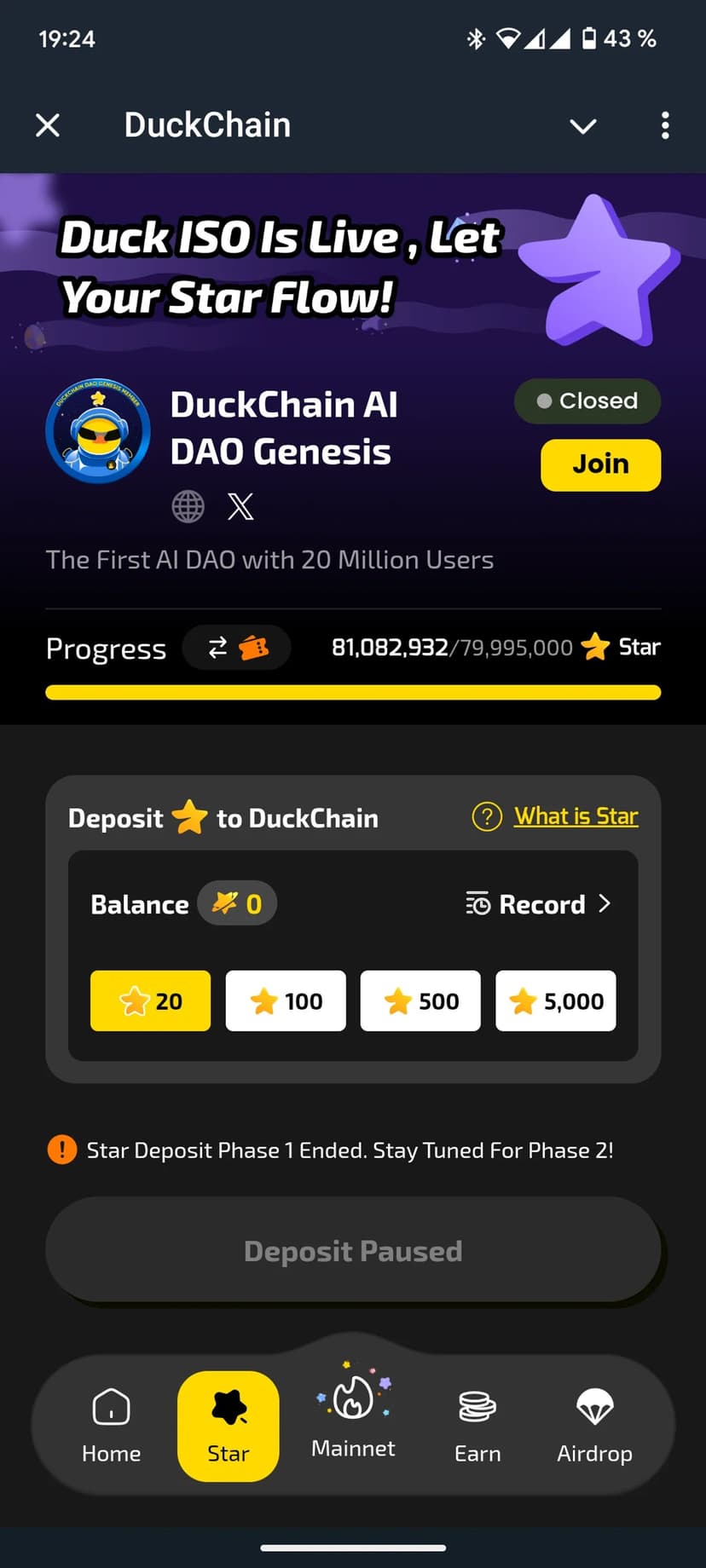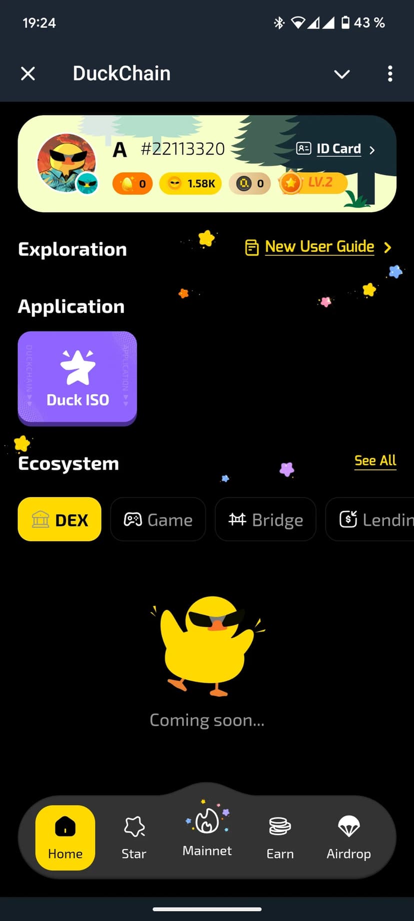 - Простая навигация: адаптированный под мобильные экраны меню с вкладками Home, Star, Mainnet, Earn и Airdrop, а также встроенные подсказки для первых шагов.
