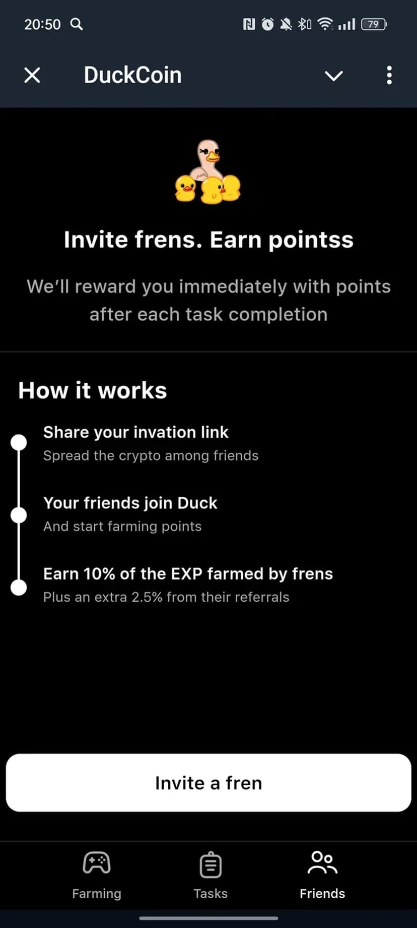 Фармите $DUCK и зарабатывайте EXP, выполняя задания и приглашая друзей.
