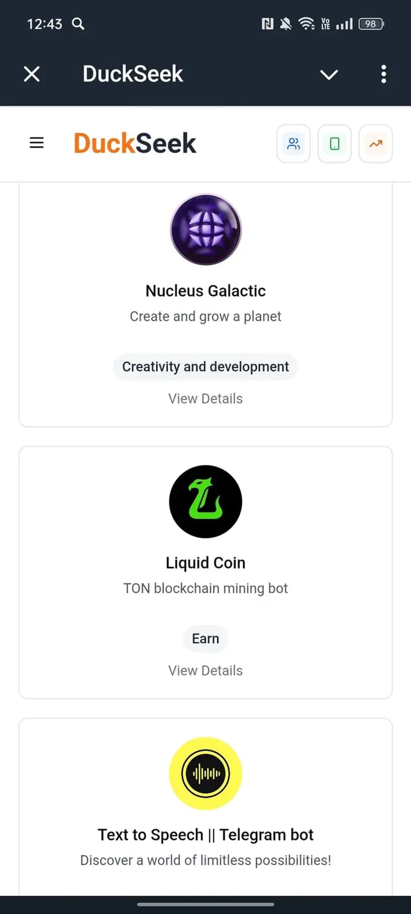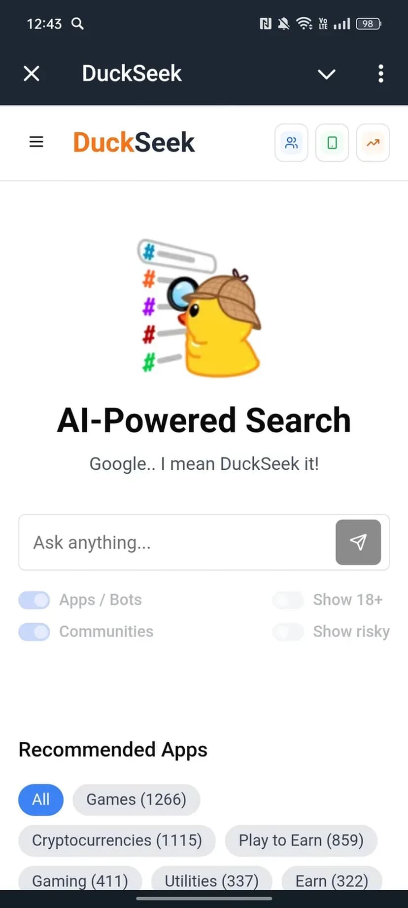 DuckSeek предлагает простой и быстрый поиск по сообществам и мини‑приложениям внутри Telegram. При запуске сразу доступна строка поиска — вводите запрос и получаете результаты в виде списка ниже.