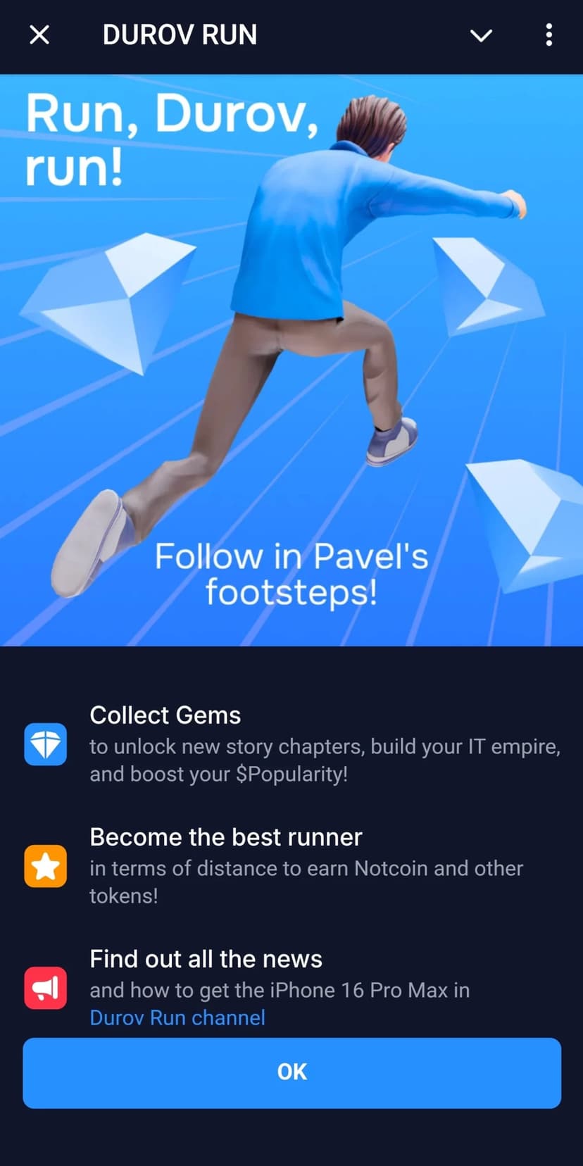 *Нажимая "Открыть в Telegram", вы перейдете к приложению Durov Run в мессенджере Telegram