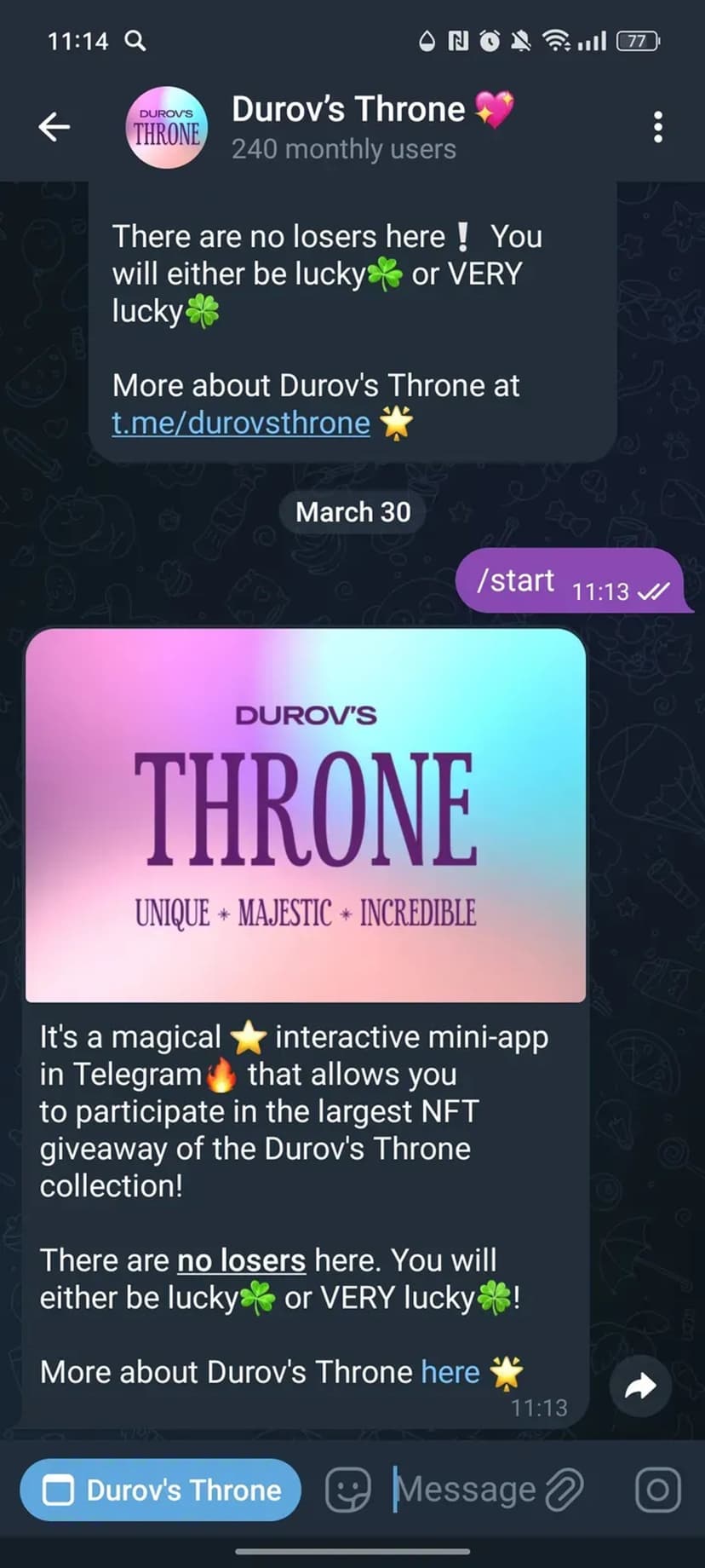 Розыгрыши NFT коллекции Durov’s Throne — вход через Telegram Auth и гарантированный приз