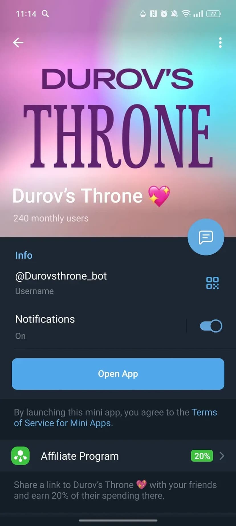 *Нажимая "Открыть в Telegram", вы перейдете к приложению Durov’s Throne 💖 в мессенджере Telegram
