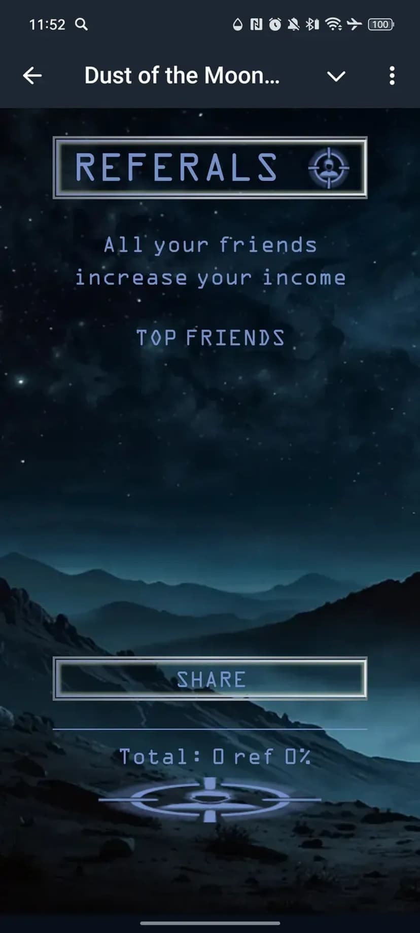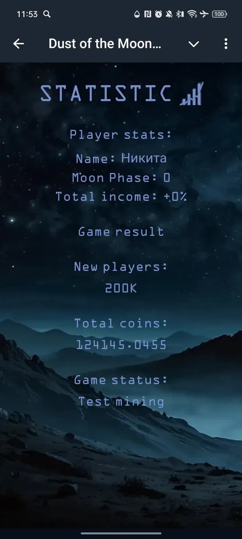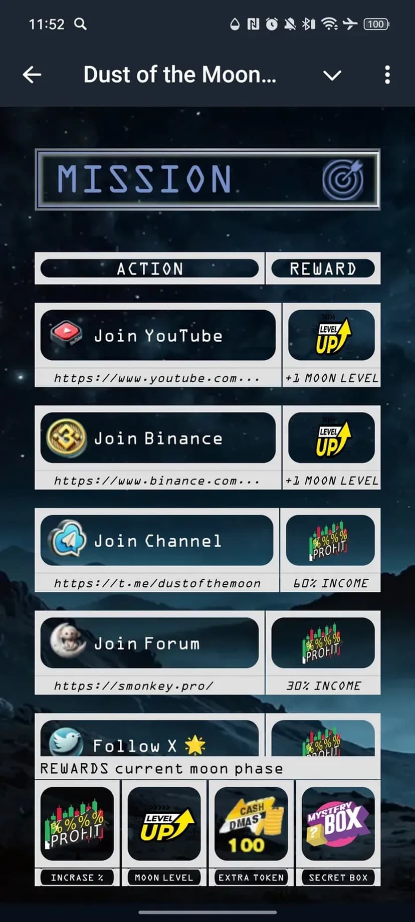При первом запуске отображаются текущая фаза луны, персональный прогресс, доступные задания и кнопки для их выполнения. Меню интуитивно — основные действия: выполнение миссий, получение токенов и просмотр лидерборда. Присутствуют уведомления о новых событиях и ссылки на социальные сети проекта для получения дополнительных бонусов.