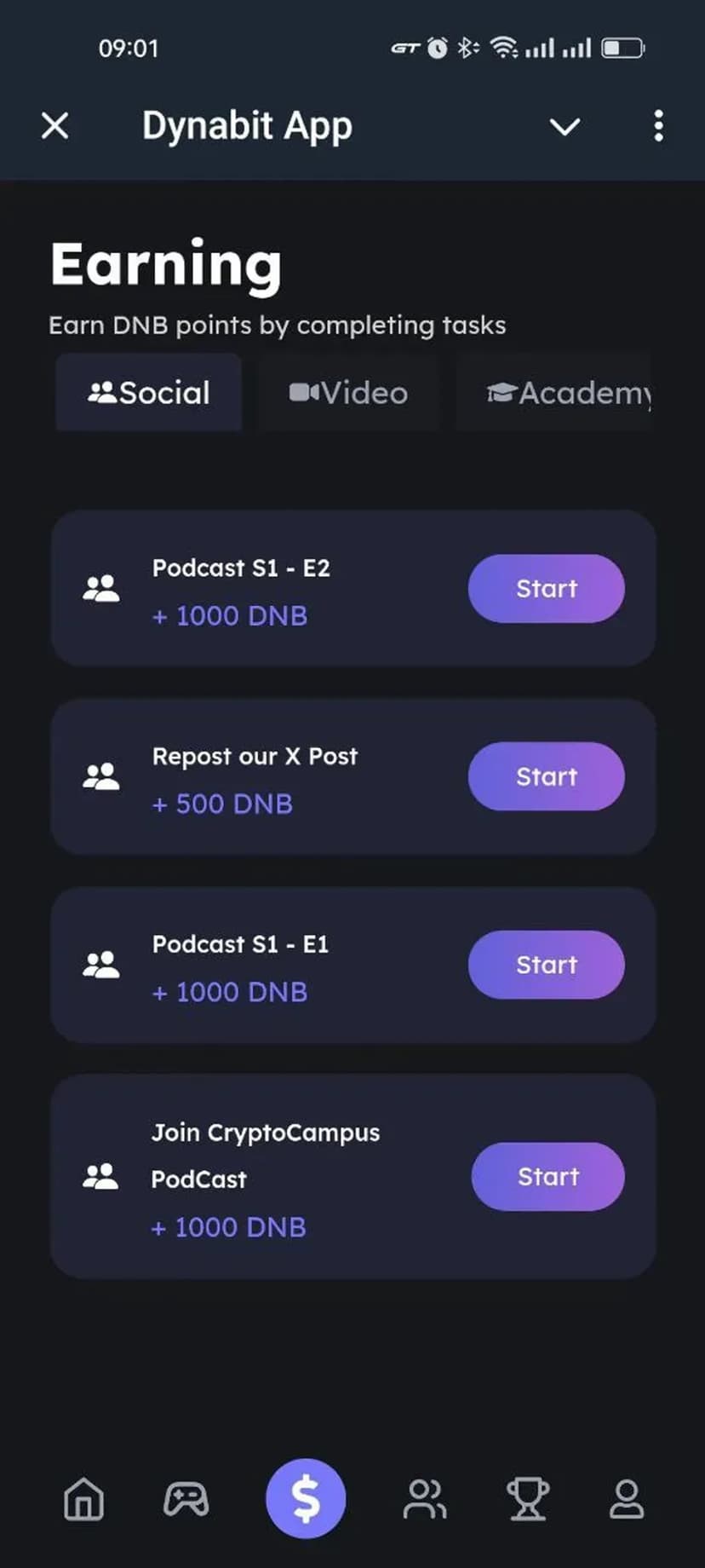 - Заработок DNB — выполняйте задания и получайте награды в токенах DNB.