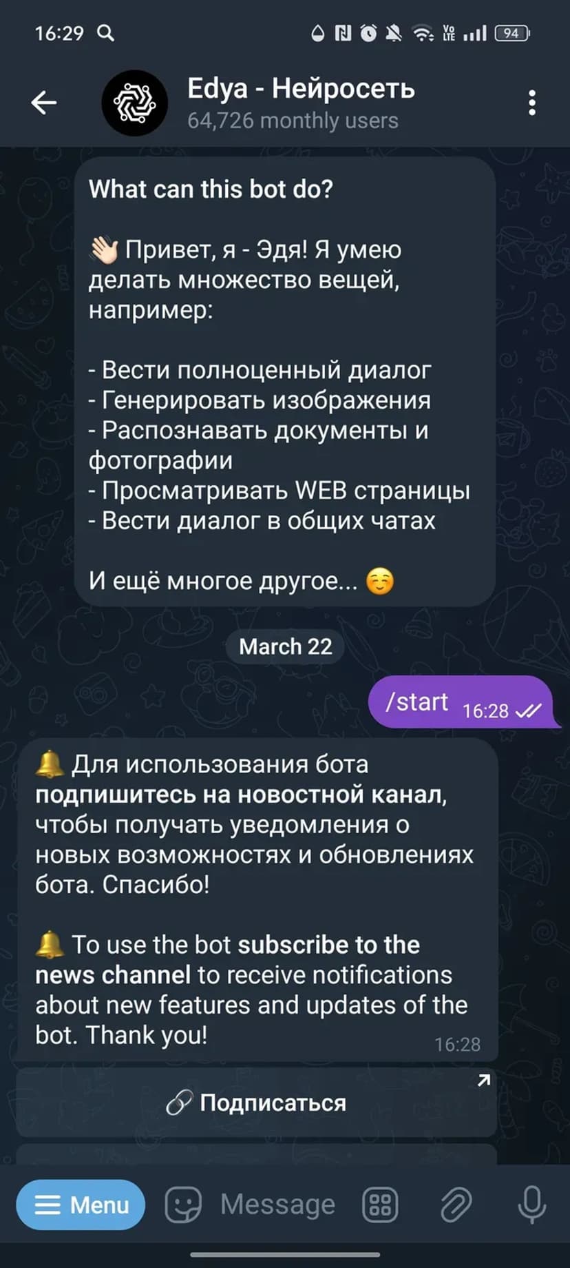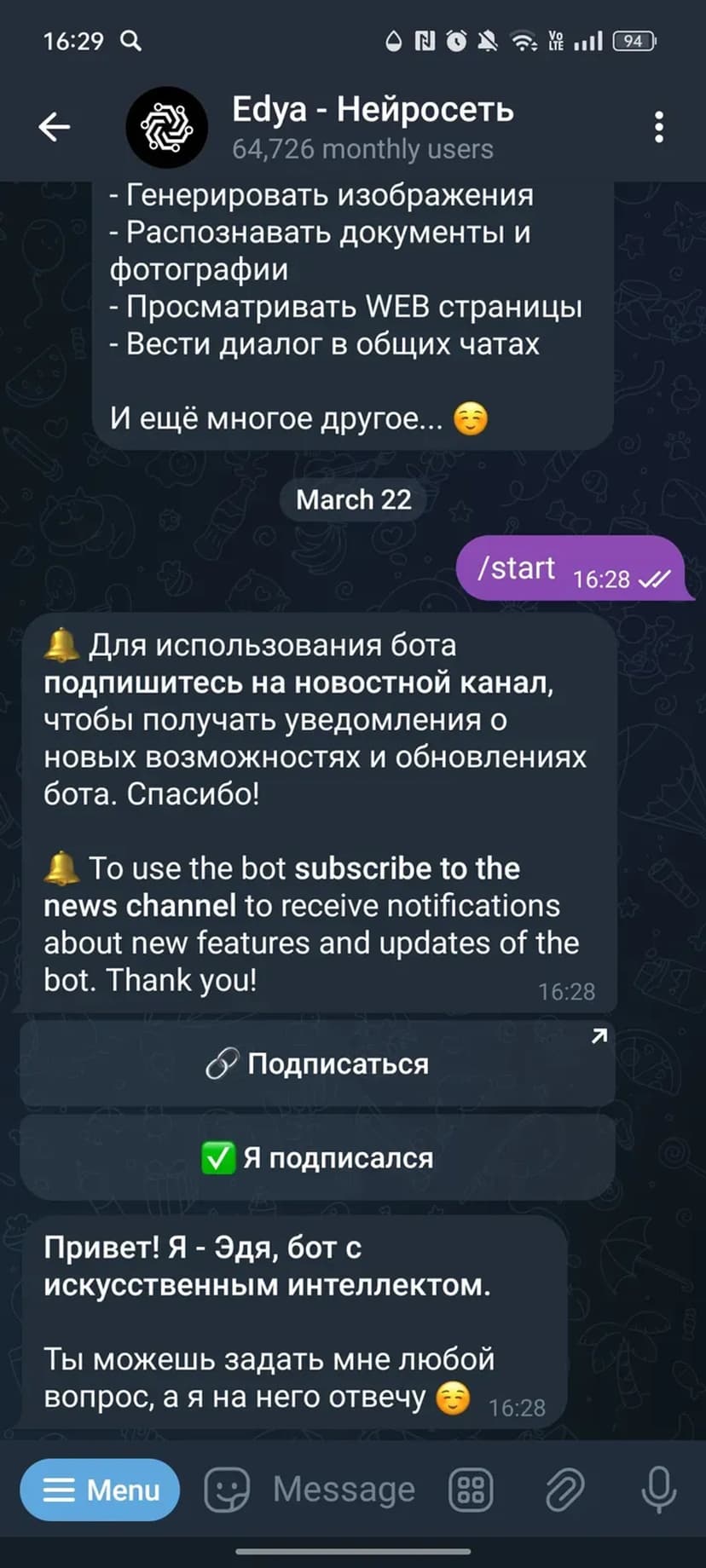 *Нажимая "Открыть в Telegram", вы перейдете к приложению Edya - Нейросеть в мессенджере Telegram