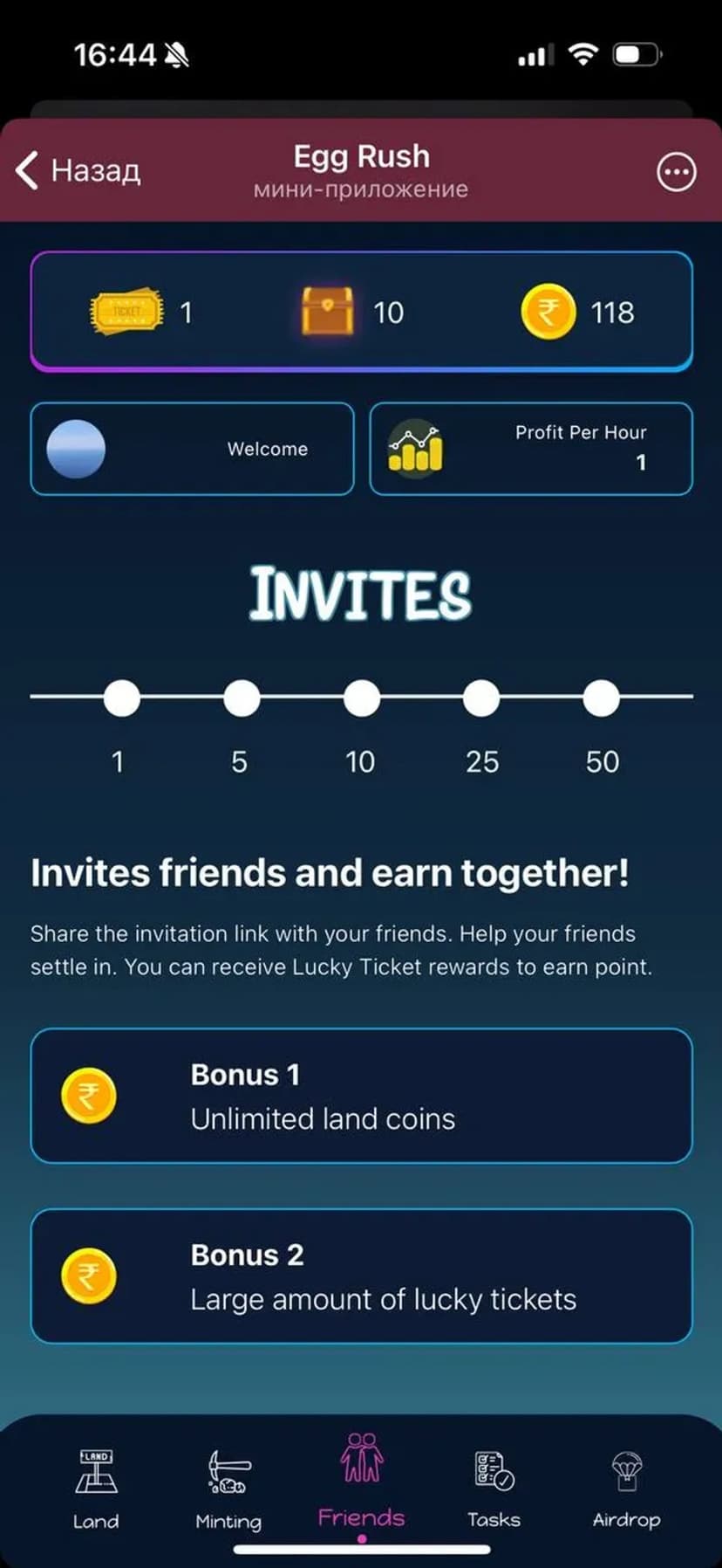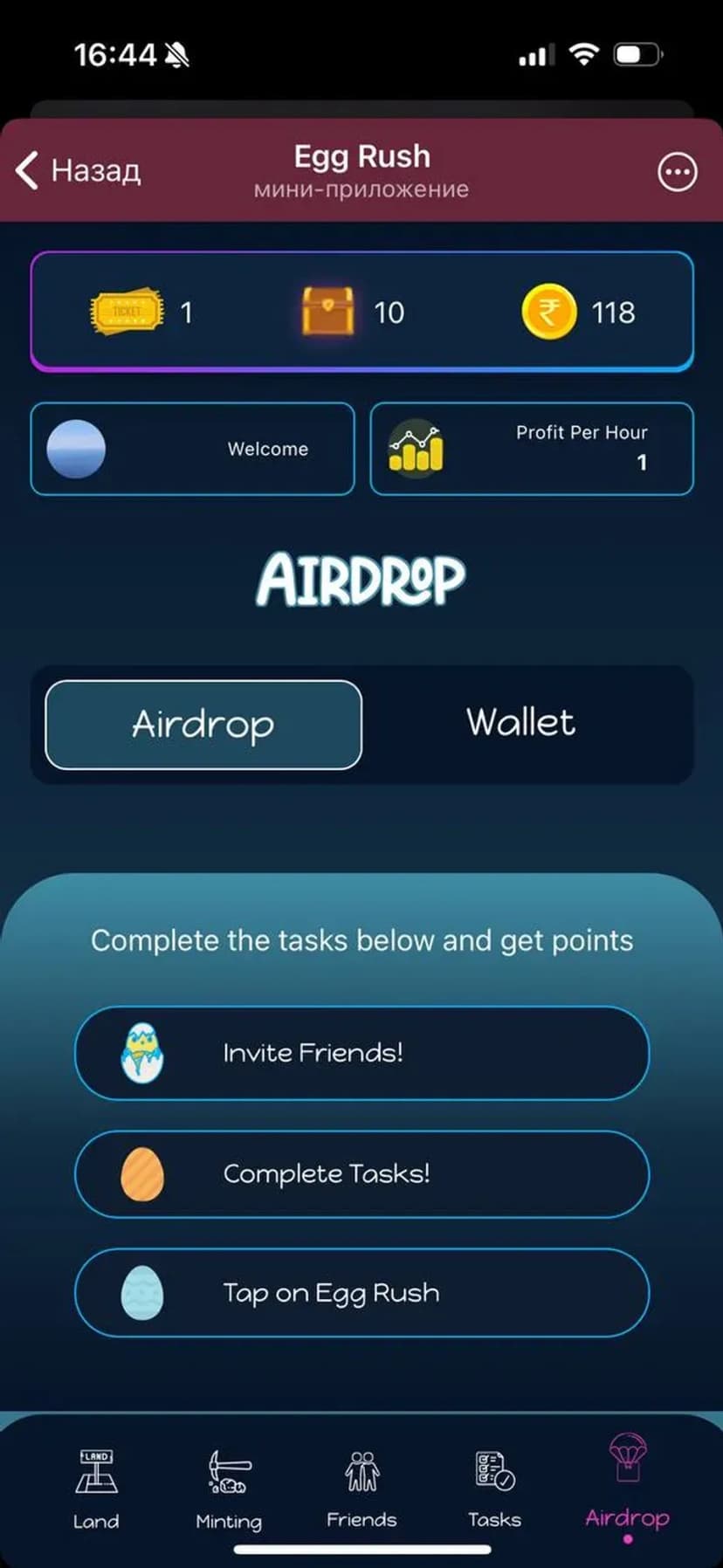 Egg Rush — бот в Telegram, объединяющий элементы геймификации, социального взаимодействия и экономических вознаграждений. Пользователи зарабатывают очки за приглашения и активность, а накопленные позиции могут получить ценность при будущих раздачах и возможном листинге токенов.