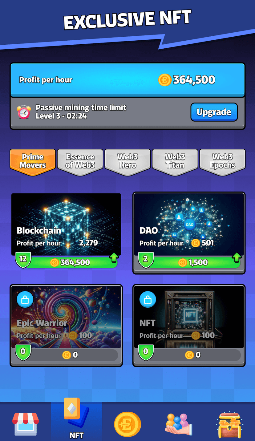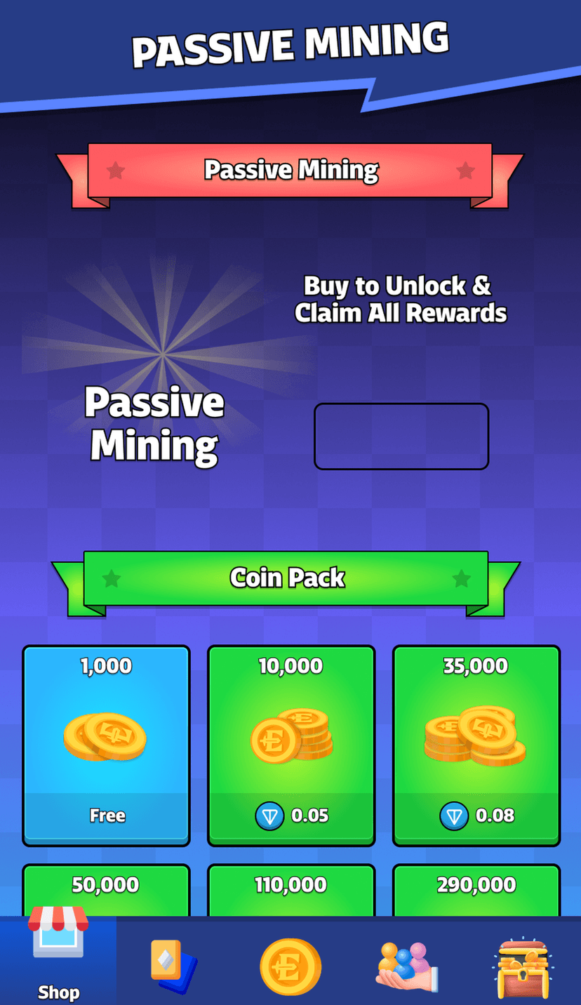 - Майнинг: активный (tap-to-mine) и пассивный сбор внутриигровых ресурсов.